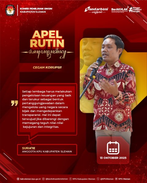 Sleman – KPU Kabupaten Sleman melaksanakan apel rutin yang diselenggarakan pada Senin (13/10) pukul 08.00 WIB yang bertempat di halaman kantor KPU Kabupaten Sleman. Sura’ie selaku Anggota KPU Kabupaten Sleman berkesempatan menjadi pembina apel menyampaikan pentingnya pencegahan korupsi. Dalam pembukaan amanatnya, Sura’ie menyampaikan hal penting untuk menjadi perhatian, yaitu pengelolaan media yang baik. Media sosial adalah wajah dari KPU Kabupaten Sleman, sehingga menjadi hal penting untuk menampilkan informasi yang akurat dan mencerminkan kekompakan suatu lembaga. Memasuki inti amanat, Sura’ie menyampaikan pentingnya upaya pencegahan korupsi di lingkungan KPU Kabupaten Sleman. Sura’ie menekankan bahwa setiap pegawai KPU Kabupaten Sleman untuk dapat menghindari dan mencegah tindak pidana korupsi, karena tidak hanya merusak kepercayaan publik, tetapi juga mencederai marwah suatu lembaga. Salah satu contohnya dengan pengelolaan keuangan yang dapat dipertanggungjawabkan. “Setiap lembaga harus melakukan pengelolaan keuangan yang baik dan terukur sebagai bentuk pertanggungjawaban dalam mengelola uang negara secara bijak dan mengedepankan transparansi. Hal ini dapat terwujud jika dibarengi dengan memegang teguh nilai-nilai kejujuran dan integritas.” ujar Sura’ie. Di akhir amanatnya, Sura’ie berpesan kepada setiap pegawai untuk terus meningkatkan kompetensi dengan memanfaatkan kegiatan knowledge sharing yang secara rutin diadakan oleh KPU Kabupaten Sleman. Lebih lanjut, Sura’ie juga mengajak seluruh pegawai untuk mengikuti kegiatan tersebut secara antusias dan maksimal. (agl) ....