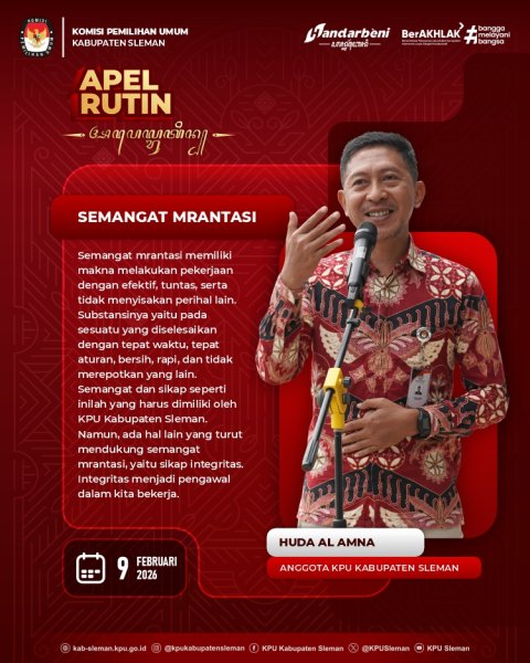 Sleman – KPU Kabupaten Sleman melaksanakan apel rutin yang diselenggarakan pada Senin (09/02) pukul 08.00 WIB yang bertempat di halaman kantor KPU Kabupaten Sleman. Huda Al Amna selaku Ketua Divisi Sosdiklih, Parmas, dan SDM KPU Kabupaten Sleman berkesempatan menjadi pembina apel. Dalam amanatnya, Huda menyerukan semangat ”mrantasi”. Mengawali amanatnya, Huda menyampaikan kepada seluruh pegawai untuk menjaga kesehatan fisik dan psikisnya, serta menata niat dalam bekerja dengan tulus agar hal-hal baik berdatangan. Melanjutkan amanatnya, Huda juga menyerukan semangat “mrantasi” dalam melakukan pekerjaan. “Semangat mrantasi memiliki makna melakukan pekerjaan dengan efektif, tuntas, serta tidak menyisakan perihal lain. Substansinya yaitu pada sesuatu yang diselesaikan dengan tepat waktu, tepat aturan, bersih, rapi, dan tidak merepotkan yang lain. Semangat dan sikap seperti inilah yang harus dimiliki oleh KPU Kabupaten Sleman. Namun, ada hal lain yang turut mendukung semangat mrantasi, yaitu sikap integritas. Integritas menjadi pengawal dalam kita bekerja.” ujar Huda. Selain semangat “mrantasi”, Huda turut menekankan kepada seluruh pegawai untuk melakukan pekerjaan dengan ikhlas. Hal ini dapat menjadi indikator dalam memberikan pelayanan kepada masyarakat dengan penuh keikhlasan, sehingga diharapkan dapat meningkatkan reputasi yang baik KPU Kabupaten Sleman. (agl)