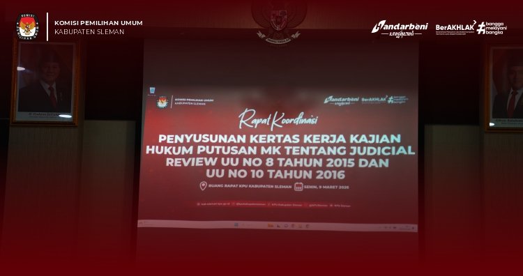 Sleman – KPU Kabupaten Sleman laksanakan Rapat Koordinasi Penyusunan Kertas Kerja Kajian Hukum Putusan Mahkamah Konstitusi Tentang Judicial Review Undang-Undang Nomor 8 Tahun 2015 dan Undang-Undang Nomor 10 Tahun 2016 Tentang Pemilihan Gubernur, Bupati, dan Walikota pada Jumat (06/03) dan Senin (09/03). Kegiatan tersebut bertujuan untuk menelaah putusan Mahkamah Konstitusi (MK) serta menyusun perspektif hukum yang dapat menjadi bahan masukan dalam pengembangan regulasi pemilihan kepala daerah ke depan. Sura’ie selaku Kadiv Hukum dan Pengawasan KPU Kabupaten Sleman berkesempatan membuka kegiatan dengan menyampaikan bahwa kegiatan tersebut dilakukan untuk menelisik satu-persatu dari 4 (empat) Putusan MK tentang pemilihan. Kemudian membuat ringkasan berdasarkan permohonan, pertimbangan hukum, dan amar putusan MK. Sementara itu, Noor Aan Muhlishoh selaku Kadiv Teknis Penyelenggaraan KPU Kabupaten Sleman menjelaskan rapat mengkaji 4 (empat) putusan MK, yaitu Putusan Nomor 60, 100, 135 Tahun 2015, dan 54 Tahun 2016. Setiap putusan dibaca dan didiskusikan secara bergilir oleh seluruh peserta rapat. Pada sesi pembahasan yang dilaksanakan pada Jumat, 6 Maret 2026, putusan yang dibahas adalah Putusan Nomor 60 Tahun 2015 dan Nomor 54 Tahun 2016. Sedangkan pada Senin, 9 Maret 2026 dibahas Putusan Nomor 100 dan Nomor 135 Tahun 2015. Hasil kajian dituangkan dalam kertas kerja kajian dengan mempertimbangkan masukan dari peserta rapat. Melalui pembahasan tersebut, peserta memperoleh pemahaman mengenai berbagai ketentuan pemilihan yang telah dilaksanakan. Kajian diharapkan dapat memberikan pemahaman yang mendalam terkait Putusan MK yang ke depan dapat menjadi dasar penyusunan dan pelaksanaan regulasi pilkada. (agl) ....