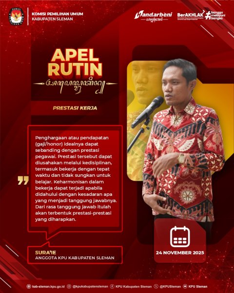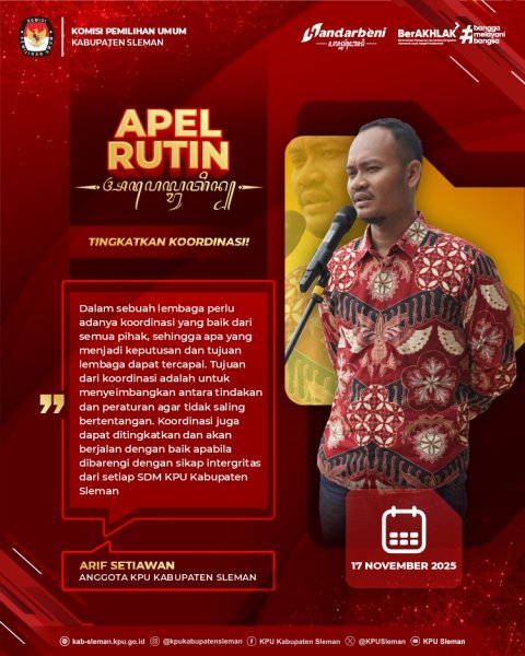 Sleman – KPU Kabupaten Sleman melaksanakan apel rutin yang diselenggarakan pada Senin (17/11) pukul 08.00 WIB yang bertempat di halaman kantor KPU Kabupaten Sleman. Arif Setiawan selaku Ketua Divisi Perencanaan, Data, dan Informasi KPU Kabupaten Sleman berkesempatan menjadi pembina apel yang menekankan pentingnya koordinasi dalam sebuah lembaga. Arif dalam awal amanatnya menekankan bahwa dalam sebuah lembaga, koordinasi menjadi proses untuk menyelaraskan kegiatan atau tujuan agar berjalan secara harmonis, efektif, dan efisien. Hal tersebut perlu dilaksanakan dan ditingkatkan karena dalam sebuah lembaga yang memiliki aktivitas tinggi, koordinasi yang baik menjadi hal yang penting. “Dalam sebuah lembaga perlu adanya koordinasi yang baik dari semua pihak, sehingga apa yang menjadi keputusan dan tujuan lembaga dapat tercapai. Tujuan dari koordinasi adalah untuk menyeimbangkan antara tindakan dan peraturan agar tidak saling bertentangan. Koordinasi juga dapat ditingkatkan dan akan berjalan dengan baik apabila dibarengi dengan sikap intergritas dari setiap SDM KPU Kabupaten Sleman”. Ujar Arif. Di akhir amanatnya, Arif menyampaikan terkait dengan pencocokan terbatas (coktas) sebagai persiapan dalam melaksanakan rapat pleno Pemutakhiran Data Pemilih Berkelanjutan (PDPB) Triwulan IV Tahun 2025. Arif berpesan agar pelaksanaan coktas dapat dikoordinasikan dengan semua pihak, baik internal maupun eksternal, serta hal-hal yang menjadi evaluasi sebelumya dapat ditindaklanjuti. (agl)