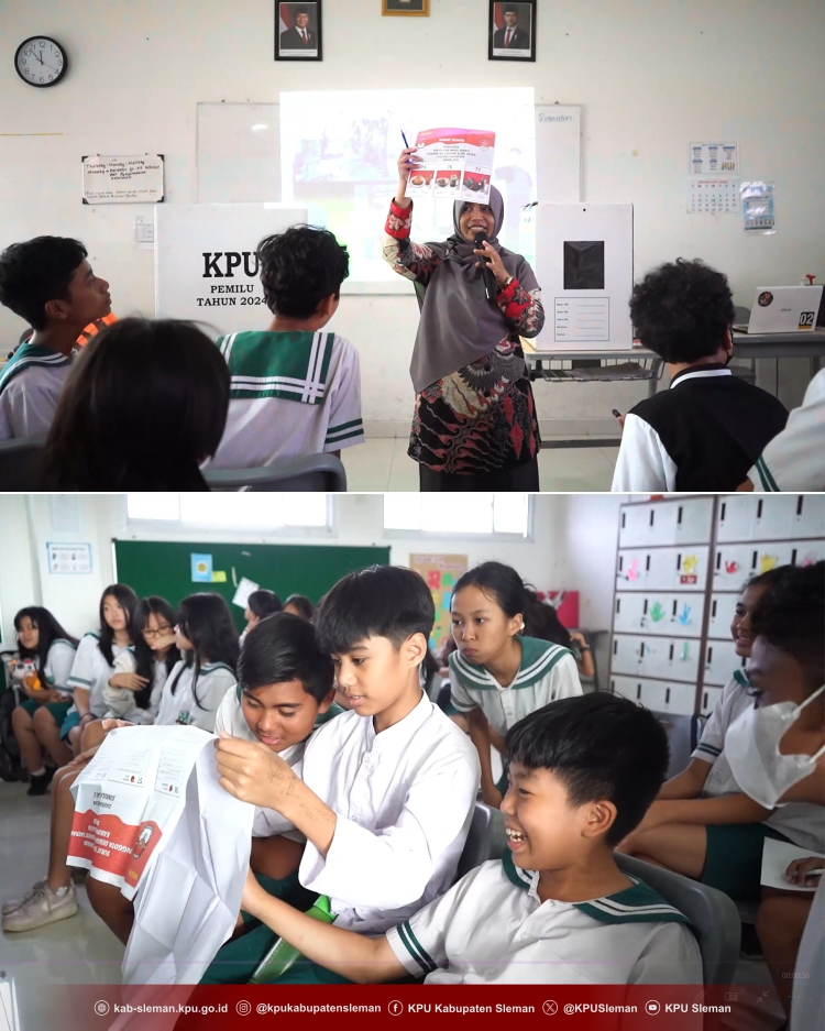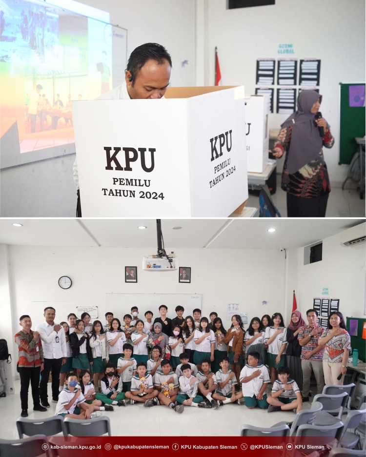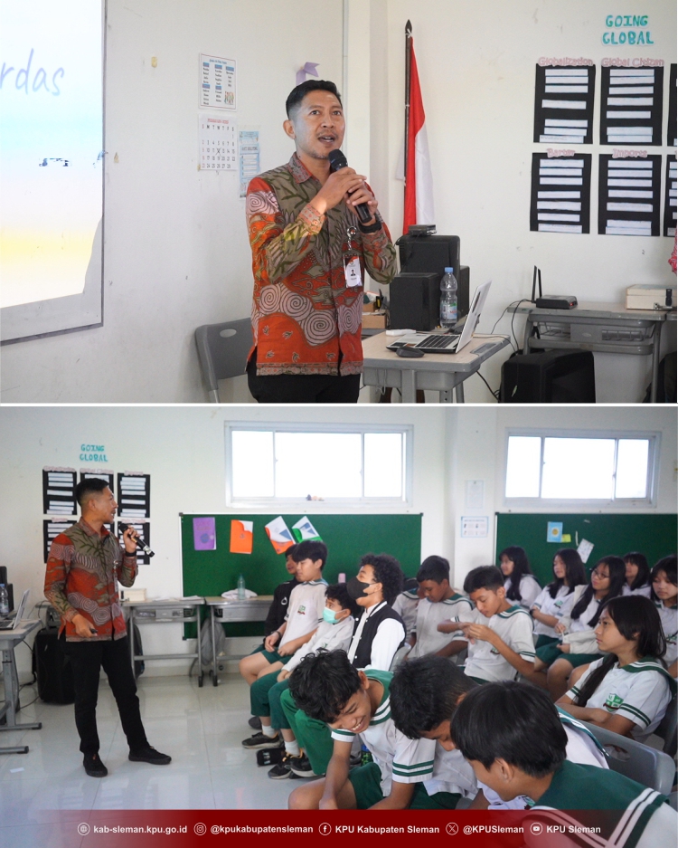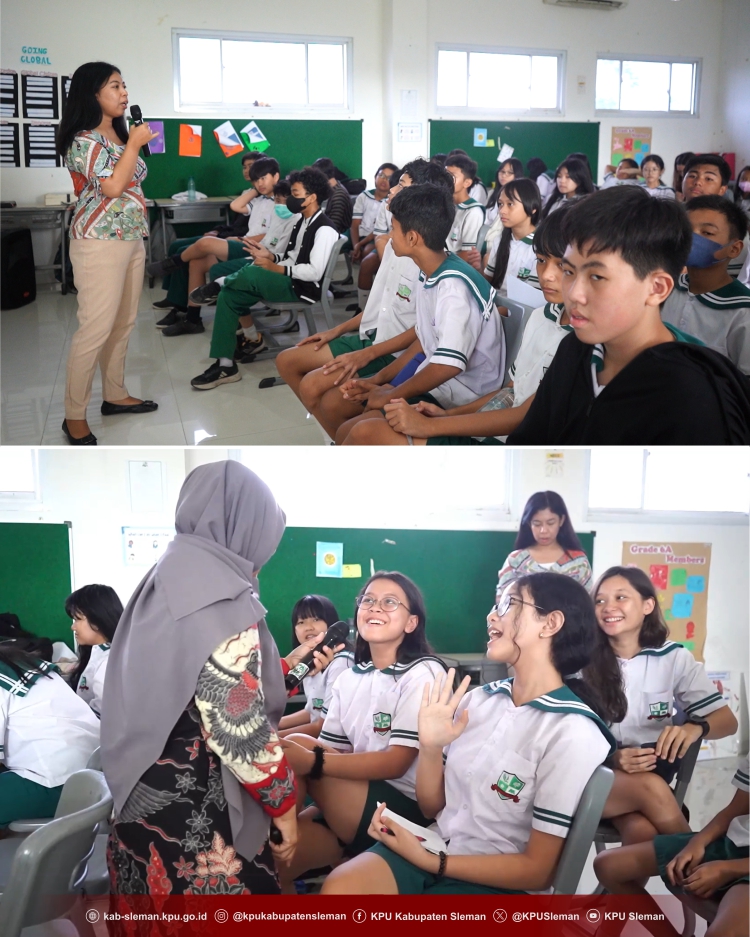 Sleman – KPU Kabupaten Sleman melanjutkan program sosialisasi dan pendidikan pemilih ke masyarakat di luar tahapan pemilu/pemilihan dengan menjadi Guestspeaker dalam kegiatan IPC Term 4 Champions for Change kelas 6 SD Cahaya Bangsa Utama (Kinderstation Primary) pada Rabu (04/06). Kegiatan diikuti oleh 38 siswa-siswi gabungan dari kelas 6A dan 6B.