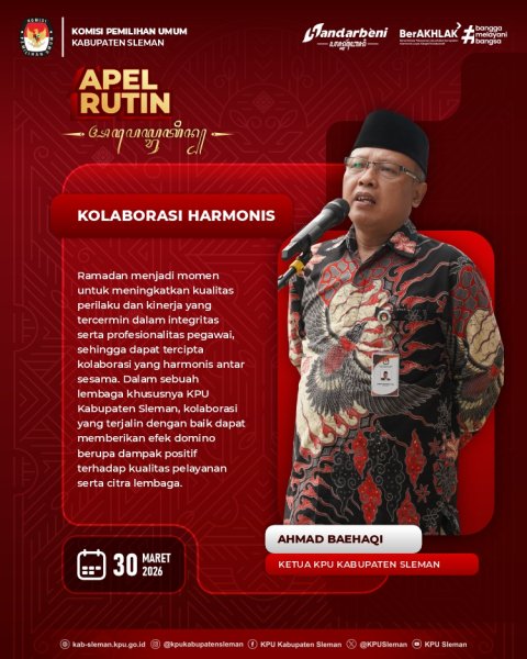 Sleman – KPU Kabupaten Sleman melaksanakan apel rutin yang diselenggarakan pada Senin (30/03) pukul 08.00 WIB yang bertempat di halaman kantor KPU Kabupaten Sleman. Ahmad Baehaqi selaku Ketua KPU Kabupaten Sleman berkesempatan menjadi pembina apel. Dalam amanatnya, Baehaqi menyampaikan Ramadan menjadi momen untuk meningkatkan kualitas perilaku serta kinerja.