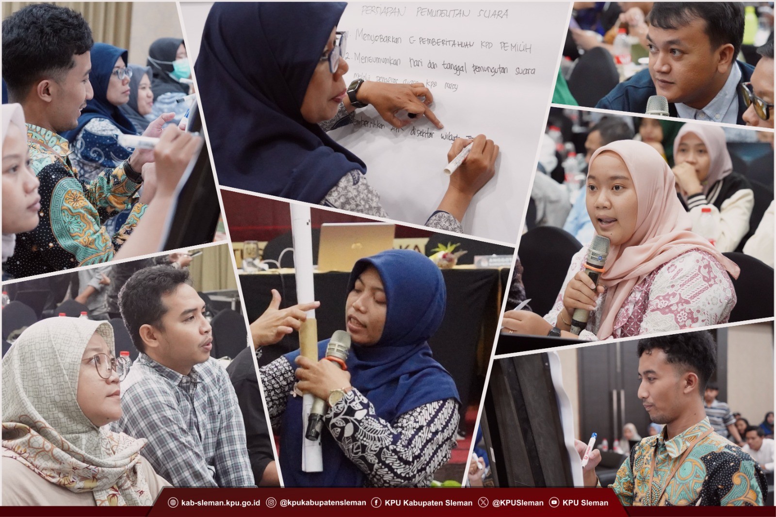 Selanjutnya pada sesi materi kedua, Noor Aan Muhlishoh selaku Ketua Divisi Teknis Penyelenggaraan KPU Kabupaten Sleman menyampaikan beberapa hal penting terkait persiapan dan pelaksanaan pemungutan dan penghitungan suara di TPS. Hal tersebut disampaikan secara interaktif dengan cara seluruh PPK dan PPS menulis poin materi yang diterima dan membacakannya di hadapan seluruh peserta. Permasalahan terkait pelaksanaan pemungutan dan penghitungan suara di TPS terbahas tuntas dengan diskusi dan tanya jawab. Dimulai dari ketugasan KPPS, pemahaman terkait jenis formulir yang diterima, mengidentifikasi surat suara sah dan tidak sah, pengisian formulir, pengenalan dan penggunaan sampul, sampai pada antisipasi kesalahan yang terjadi pada Pemilu 2024.