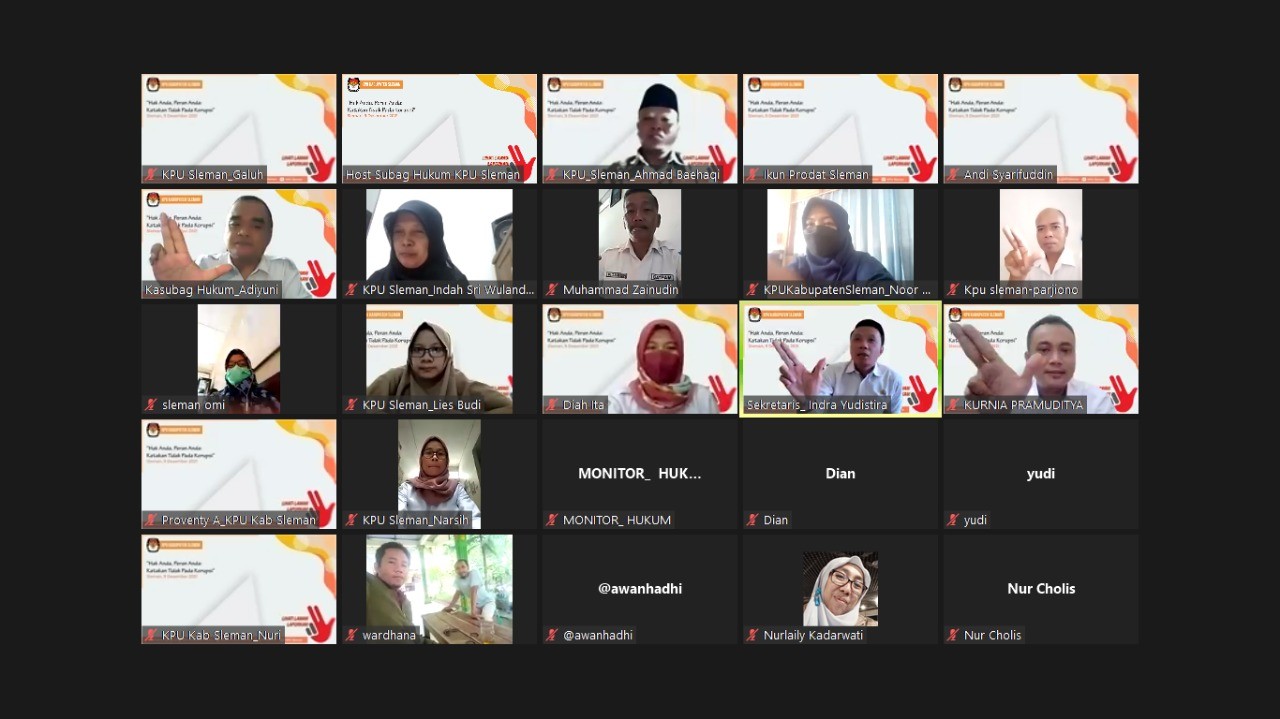 Sleman (09/12) - Dalam rangka memperingati Hari Anti Korupsi Sedunia yang jatuh pada tanggal 9 Desember 2021, KPU Kabupaten Sleman menyelenggarakan kajian hukum dengan tema " Hak Anda, Peran Anda : Katakan Tidak Pada Korupsi".