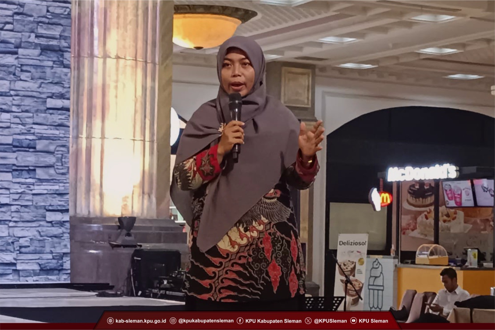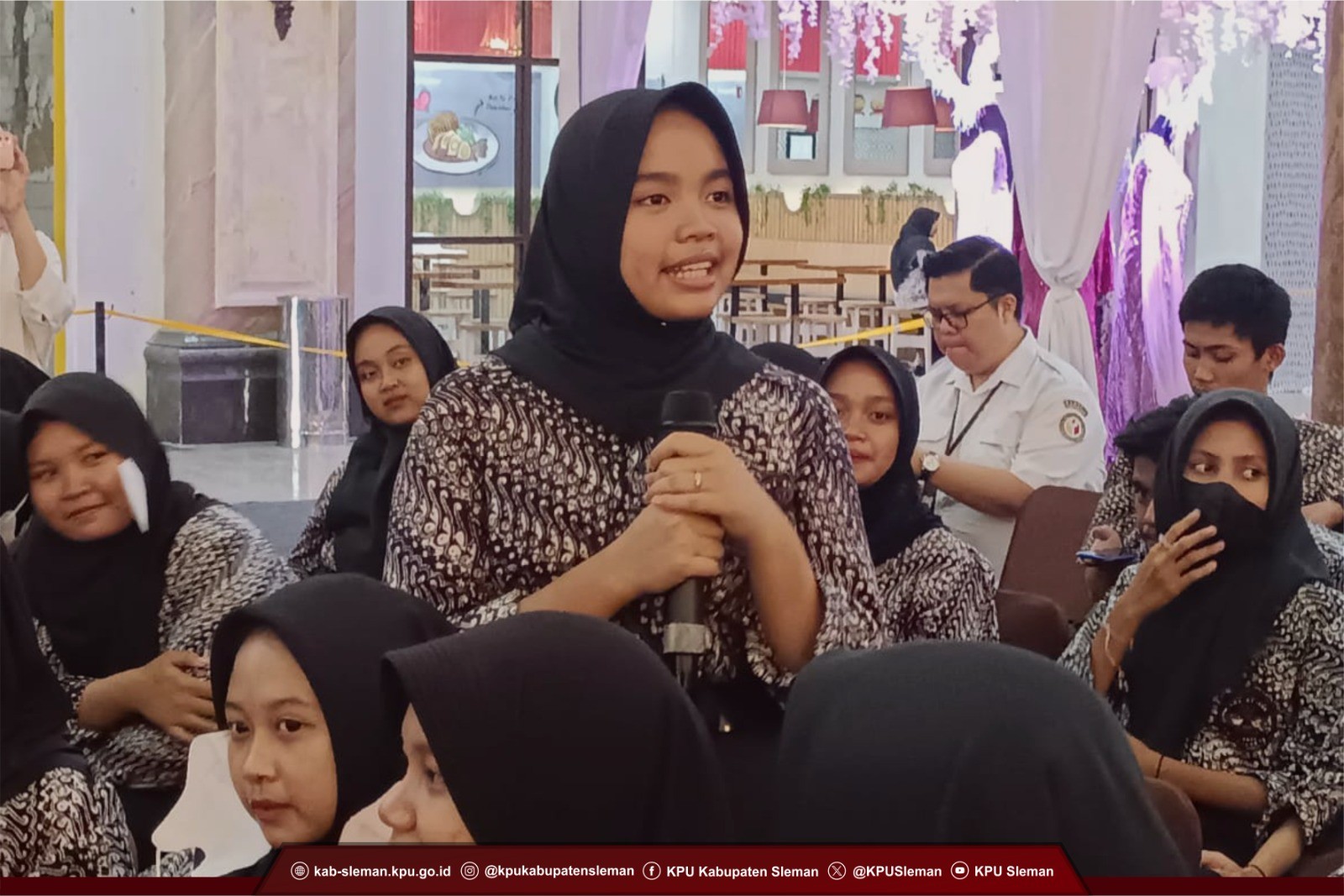 Sleman (15/11) – Ketua Divisi Penyelenggaran KPU Kabupaten Sleman, Noor Aan Muhlishoh menjadi narasumber dalam acara Ngopi Darat “Ngobrol Hepi Sarat Manfaat” yang diselenggarakan oleh Badan Kesatuan Bangsa dan Politik Kabupaten Sleman bekerja sama dengan Radio Republik Indonesia dan disponsori oleh Badan Musyawarah Perbankan Daerah DIY. Kegiatan yang digelar pada 15 November 2023 dilaksanakan di Atrium Sleman City Hall ini dihadiri oleh 70 siswa SMA Kolombo beserta guru pendamping, dan disaksikan pula oleh pengunjung Sleman City Hall.