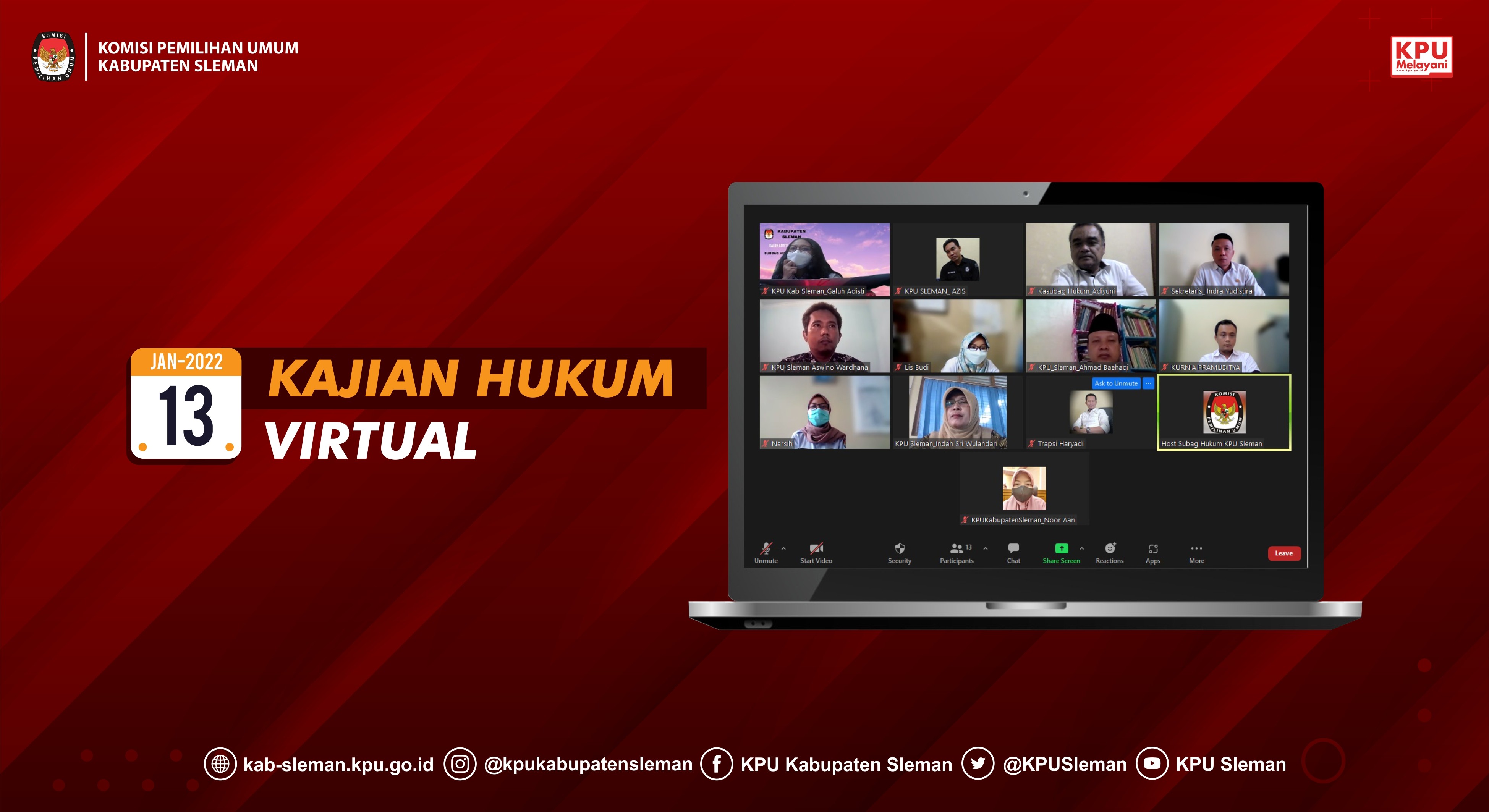 Sleman - (14/01) - Komisi Pemilihan Umum Kabupaten Sleman menyelenggarakan kajian hukum tentang Pusat Pelayanan Informasi dan Dokumentasi (PPID) secara daring pada Kamis (13/01). Kegiatan internal ini melibatkan Ketua dan Anggota, Sekretaris, Kepala Sub Bagian, Staf Sub Bagian Hukum serta Sub Bagian Teknis dan Hupmas. Dalam kajian tersebut, Ahmad Baehaqi selaku Ketua Divisi Hukum dan Pengawasan KPU Kabupaten Sleman memberikan pemaparan materi berdasarkan aturan dan keputusan KPU tentang pelayanan informasi. “Tujuan dari kajian hukum ini dalam rangka agar pelayanan informasi publik di tingkat KPU Kabupaten Sleman dapat diketahui dan berjalan dengan baik dan optimal” paparnya saat membuka materi.