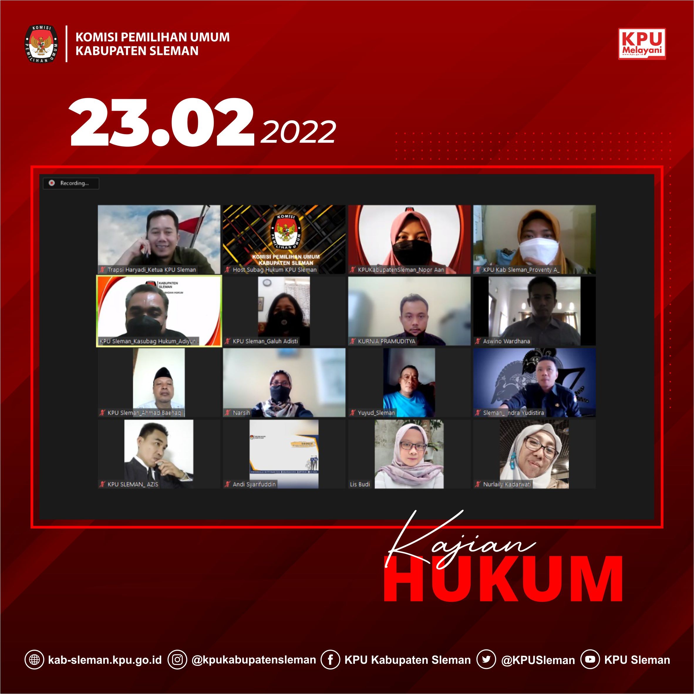Sleman (24/02) - KPU Kabupaten Sleman melakukan kajian hukum secara virtual pada Rabu (23/02). Sebagai bentuk persiapan jelang Pemilu Serentak Tahun 2024, tema yang diangkat tentang Verifikasi Partai Politik dalam tahapan pendaftaran peserta pemilu. Peserta kajian hukum berasal dari internal KPU Kabupaten Sleman yang hadir melalui pranala Zoom Cloud Meeting.