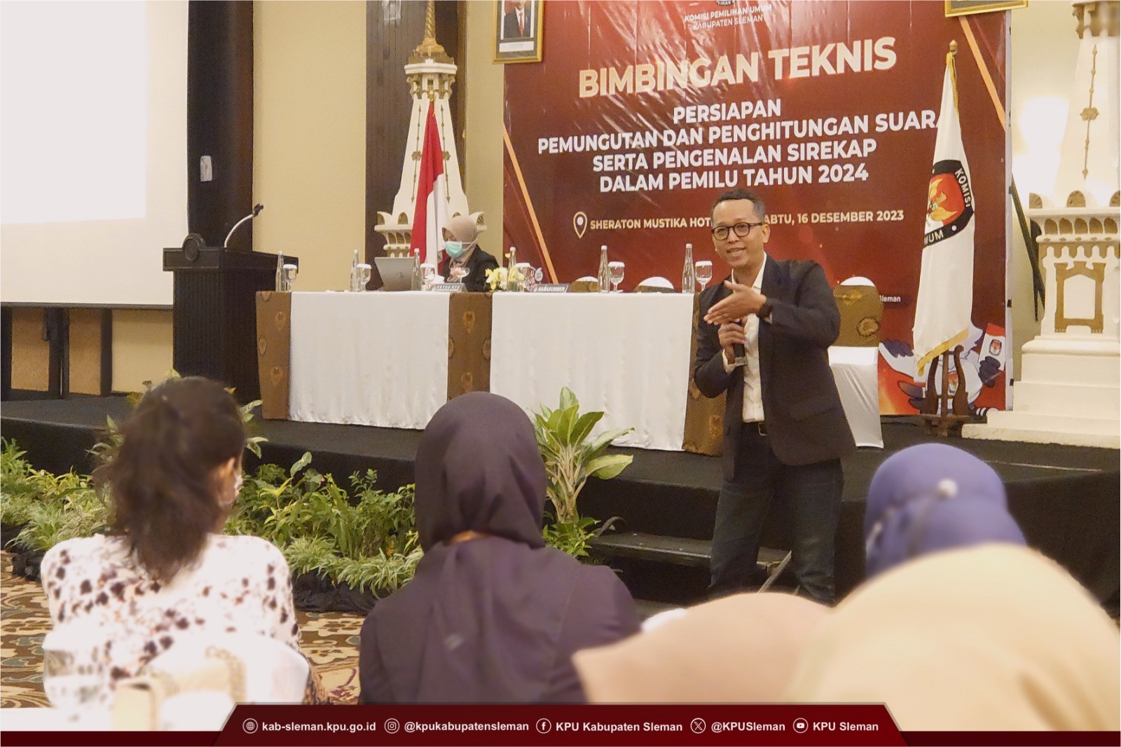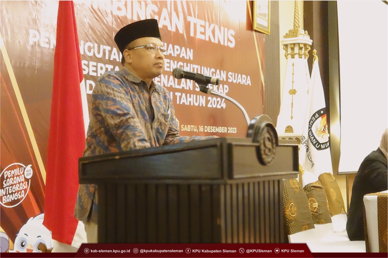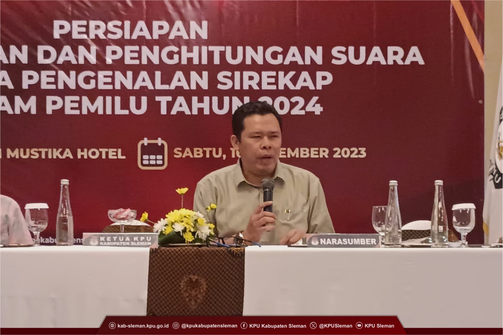 Sleman (28/12) - KPU Kabupaten Sleman melaksanakan Bimbingan Teknis Persiapan Pemungutan dan Penghitungan Suara serta Pengenalan SIREKAP dalam Pemilu Tahun 2024 pada Sabtu (16/12) yang bertempat di Hotel Sheraton Mustika Yogyakarta. Kegiatan tersebut mengundang Badan Adhoc PPK dan PPS se-Kabupaten.