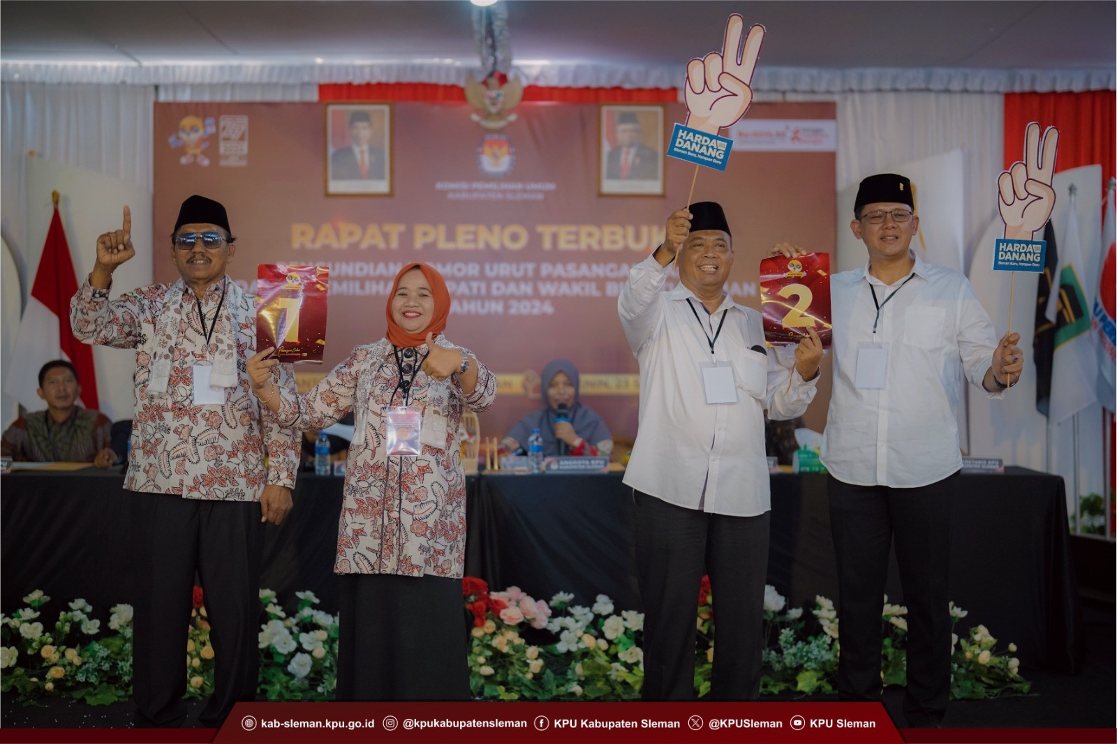 Penyerahan Salinan Keputusan KPU tentang Penetapan Nomor Urut Pasangan Calon Peserta Pemilihan Bupati dan Wakil Bupati Sleman Tahun 2024 disampaikan oleh Ketua KPU Kabupaten Sleman kepada KPU DIY, masing-masing pasangan Calon Bupati dan Wakil Bupati Sleman, dan Bawaslu Kabupaten Sleman. Setelahnya, dilakukan dokumentasi penyerahan plakat nomor urut kepada masing-masing pasangan Calon Bupati dan Wakil Bupati Sleman dan kegiatan tersebut ditutup oleh Ketua KPU Kabupaten Sleman. Acara berjalan dengan khidmat dan penuh semarak. (win)