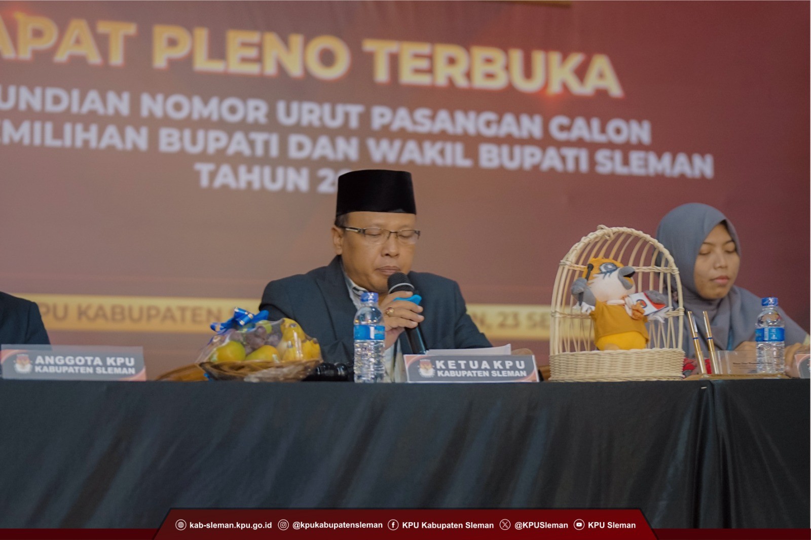 Sleman (24/09) - Dalam rangka melaksanakan tahapan pencalonan, KPU Kabupaten Sleman melaksanakan Rapat Pleno Terbuka Pengundian Nomor Urut Pasangan Calon Pemilihan Bupati dan Wakil Bupati Sleman Tahun 2024 pada Senin (23/09) pukul 09.00 WIB. Hadir dalam kegiatan tersebut yakni stakeholder terkait, Ketua KPU DIY, Ketua dan Anggota Bawaslu Kabupaten Sleman, Pasangan Calon Bupati dan Wakil Bupati Sleman atas nama Harda Kiswaya – Danang Maharsa, Pasangan Calon Bupati dan Wakil Bupati Sleman atas nama Kustini Sri Purnomo – Sukamto, serta pendamping, penghubung, partai politik pengusul dan pendukung, dan media dari masing-masing pasangan calon.