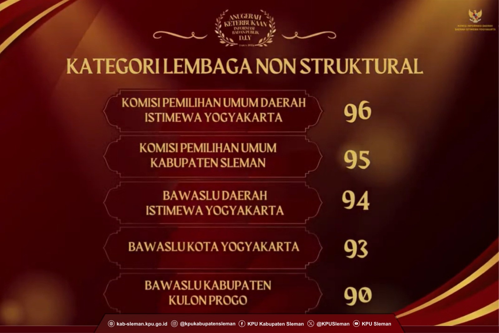 Terdapat 63 badan publik informatif telah dirilis oleh KID DIY yang terbagi dalam 9 klaster penghargaan. Hasil yang dicapai oleh KPU Kabupaten Sleman sebagai Badan Publik Informatif Terbaik Kedua dalam klaster lembaga non struktral se-DIY. Penentuan tersebut didasarkan pada sarana dan prasarana, komitmen organisasi, digitalisasi, jenis informasi, kualitas informasi, sampai dalam hal pelayanan dengan total nilai 95 (Sembilan puluh lima) dan kualifikasi informatif.