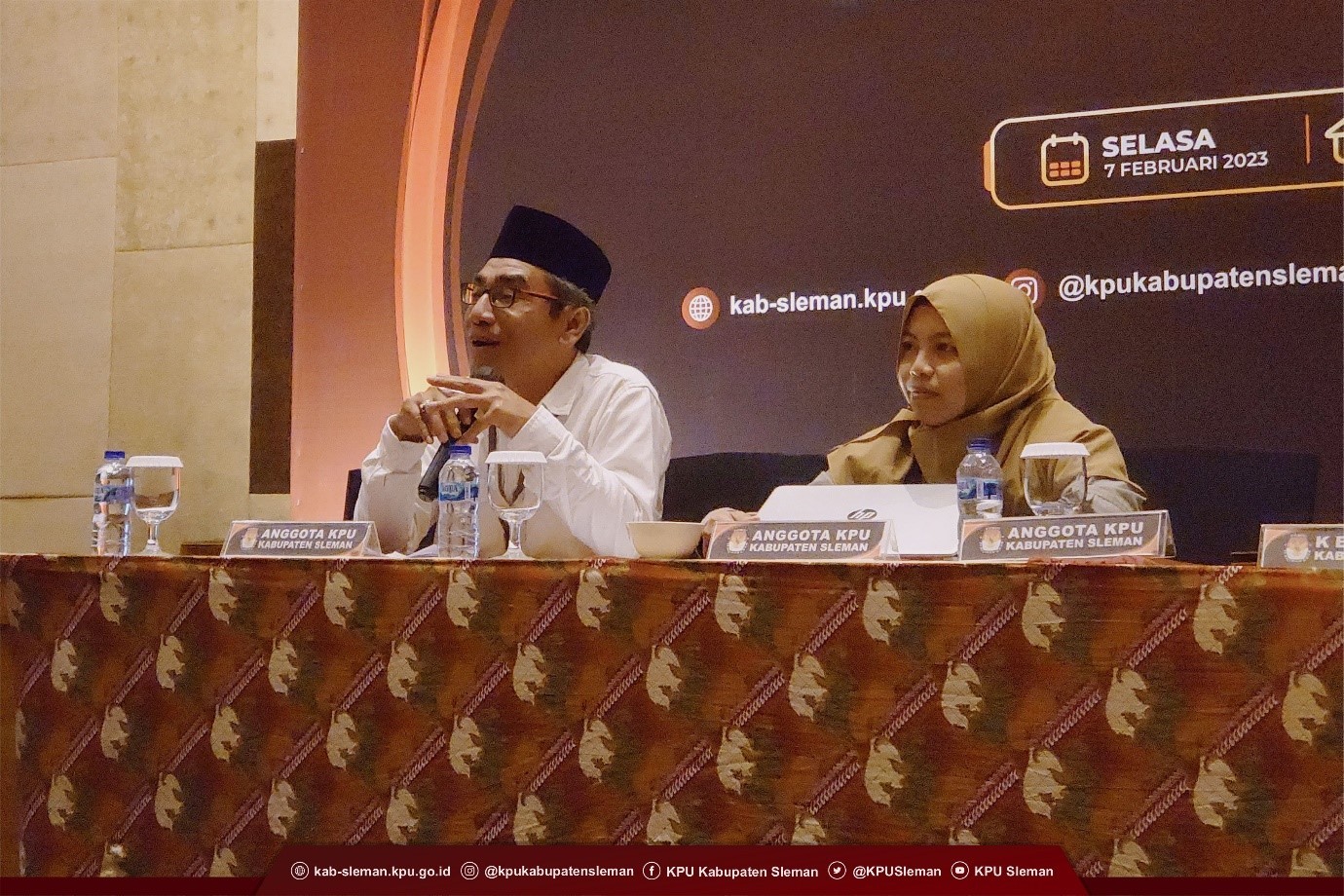Didapuk sebagai narasumber yaitu Ketua Divisi Teknis Penyelenggaraan KPU Kabupaten Sleman Noor Aan Muhlishoh dan Mujibur Rahman, Koordinator Divisi Penyelesaian Sengketa Badan Pengawas Pemilu Kabupaten Sleman dan yang bertindak sebagai moderator yakni Kasubag Teknis, Partisipasi dan Hubungan Masyarakat KPU Kabupaten Sleman, Yuyud Futrama. Acara ini dibuka langsung oleh Ketua KPU Kabupaten Sleman Trapsi Haryadi. Dalam sambutannya beliau menyampaikan terkait teknis pelaksanaan verifikasi faktual dukungan pemilih bakal calon anggota DPD RI kepada PPK dan PPS dalam Pemilihan Umum 2024 dan bersama-sama berkomitmen untuk siap melaksanakan bimbingan teknis dengan fokus dan bersungguh-sungguh.