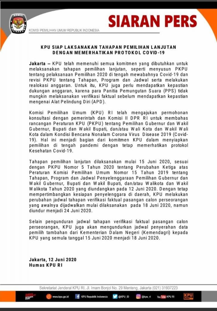 Dalam siaran pers KPU RI menyampaikan terkait tahapan pemilihan lanjutan yang akan dimulai 15 Juni 2020 sesuai dengan Peraturan KPU Nomor 5 tahun 2020 tentang Perubahan Ketiga atas Peraturan KPU Nomor 15 tahun 2019 tentang Pemilihan Gubernur dan wakil gubernur, Bupati dan Wakil Bupati dan/atau Walikota dan Wakil Walikota tahun 2020 yang diundangkan pada 12 Juni 2020.