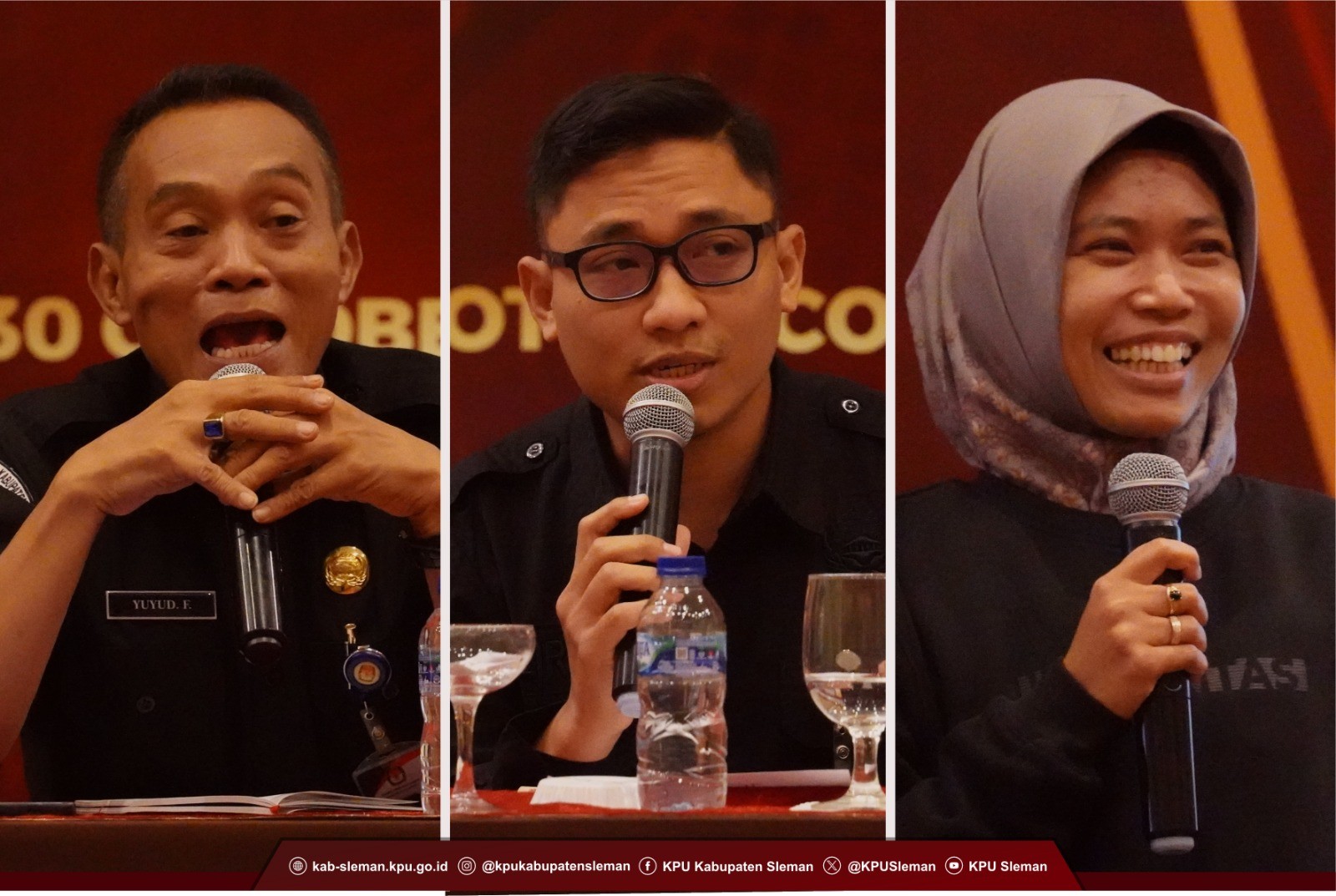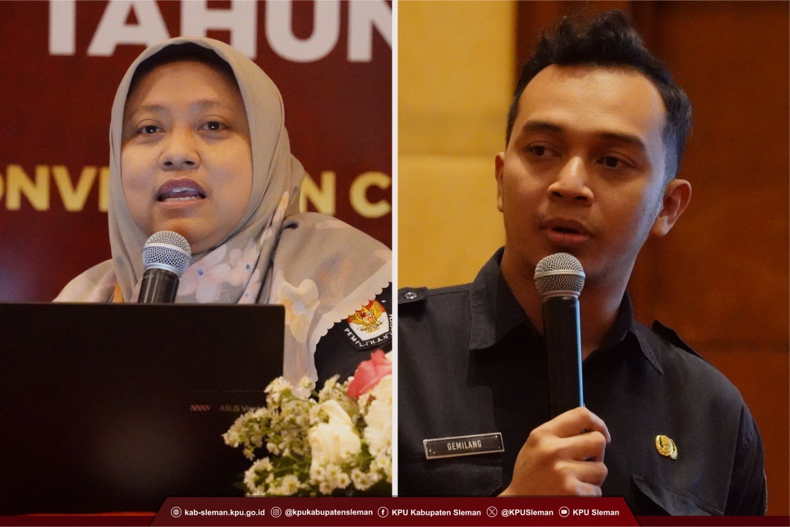 Sementara itu, memasuki materi secara bergantian narasumber menyampaikan pemaparannya, yaitu dari KPU Kabupaten Sleman oleh Meirino Setiyaji selaku Kasubbag Keuangan, Umum, dan Logistik dan Proventy Arisonatalia selaku Pejabat Pembuat Komitmen. Keduanya secara bergantian memaparkan terkait mekanisme penyaluran dan pertanggungjawaban penggunaan dana tahapan pemilihan serentak bagi badan ad hoc, format dokumen, pajak yang dikenakan, sampai pada kegiatan badan ad hoc seperti simulasi tungsura, bimbingan teknis, pelantikan, hingga operasional di TPS.