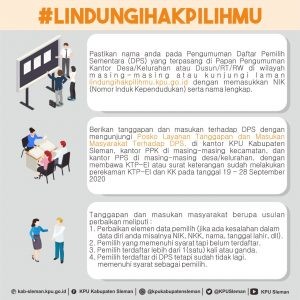 Sleman (20/09) – Pada tanggal 19 September 2020 kemarin, telah diumumkan nama pemilih dalam Daftar Pemilih Sementara (DPS) Pemilihan Bupati dan Wakil Bupati Sleman Tahun 2020 melalui papan pengumuman yang ada di tingkat kantor Desa/Kelurahan atau Dusun tingkat Rukun Tetangga (RT) dan Rukun Warga (RW) se-Kabupaten Sleman. Daftar Pemilih Sementara (DPS) juga dapat di cek melalui laman lindungihakpilihmu.kpu.go.id dengan menuliskan Nomor Induk Kependudukan (NIK) serta nama lengkap.