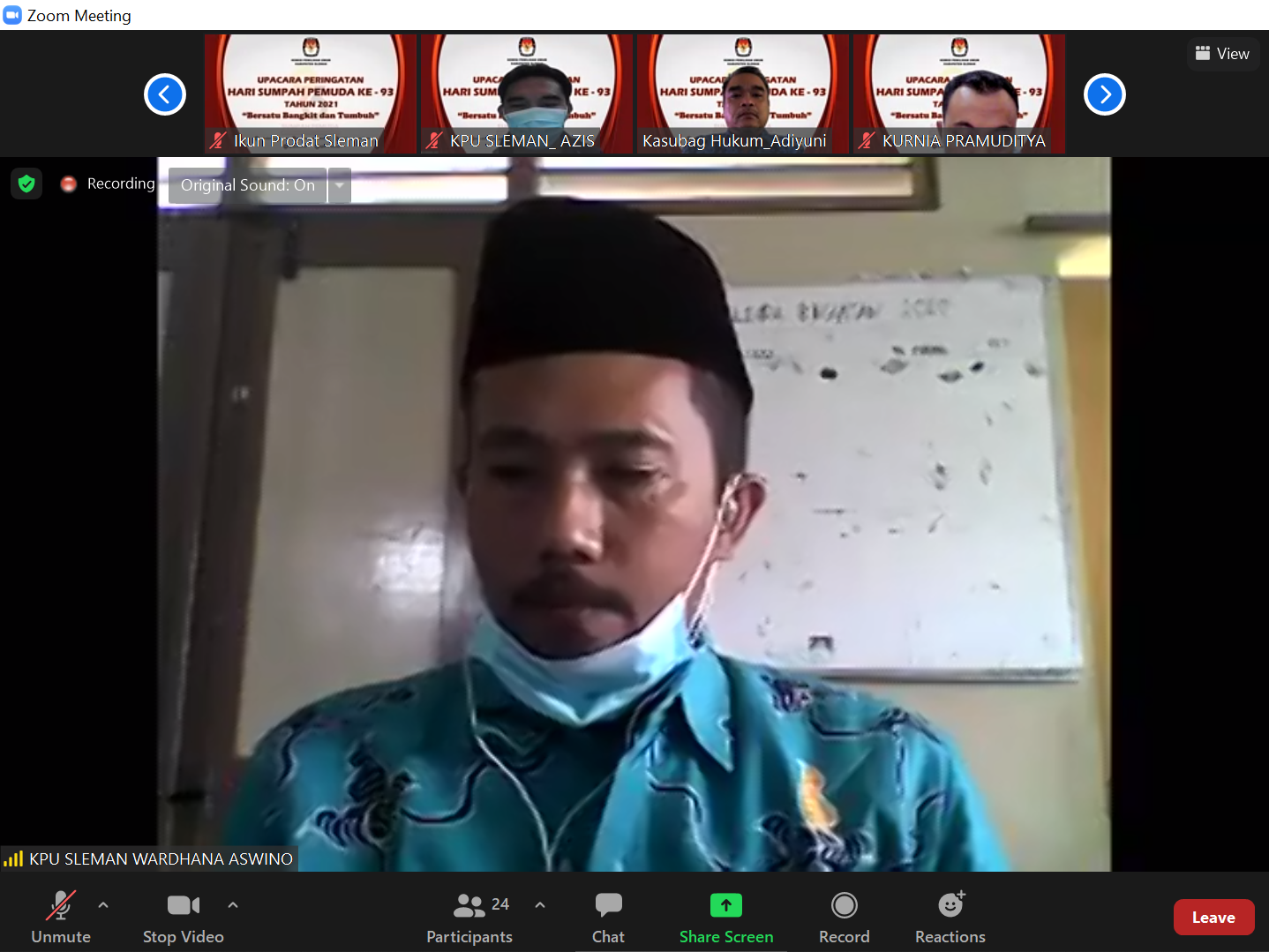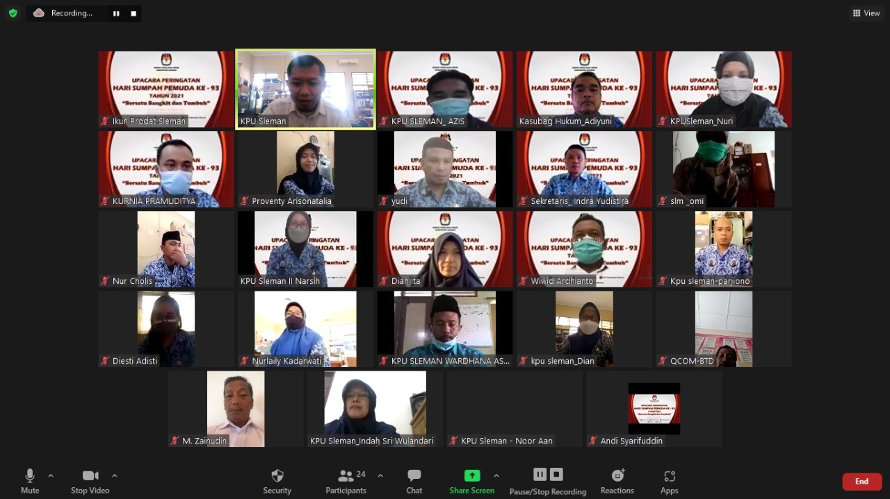 Sleman (28/10) – Hari Sumpah Pemuda yang ke-93 tahun diperingati hari ini Kamis, 28 Oktober 2021. KPU Kabupaten Sleman gelar apel peringatan Hari Sumpah Pemuda secara virtual melalui pranala Zoom Cloud Meeting. Kegiatan ini dilaksanakan sebagai tindak lanjut Surat Edaran KPU RI Nomor 21 Tahun 2021 tentang Peringatan Hari Sumpah Pemuda Ke-93 Tahun 2021.
