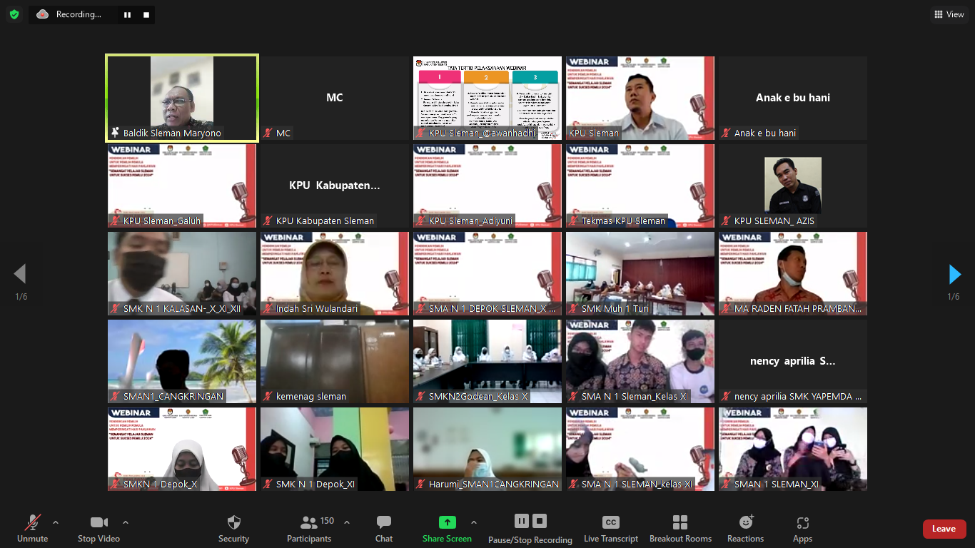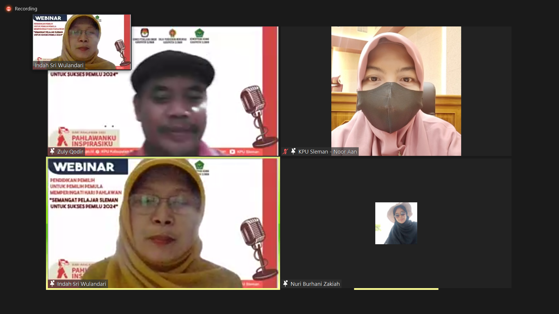 KPU Kabupaten Sleman melaksanakan webinar dengan mengambil momentum Hari Pahlawan Nasional. Pendidikan pemilih melalui kegiatan webinar ini merupakan kegiatan perdana yang menyasar pelajar sebagai pemilih pemula, sehingga dalam pelaksanaanya KPU Kabupaten Sleman bekerjasama dengan Balai Pendidikan Menengah Kabupaten Sleman serta Kantor Wilyah Kementerian Agama Kabupaten Sleman.