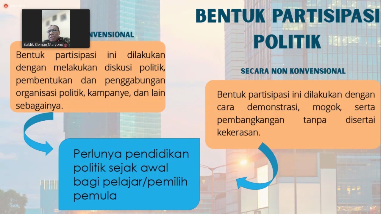 Sleman (11/11) - Kegiatan pendidikan pemililh merupakan hal mendesak yang harus terus dilakukan untuk merawat tingkat partisipasi masyarakat dalam mengawal demokrasi. Tingkat partisipasi masyarakat merupakan salah satu indikator keberhasilan dalam sebuah negara demokrasi. Atas hal itulah, KPU Kabupaten Sleman melaksanakan pendidikan pemilih untuk pemilih pemula melalui kegiatan webinar.