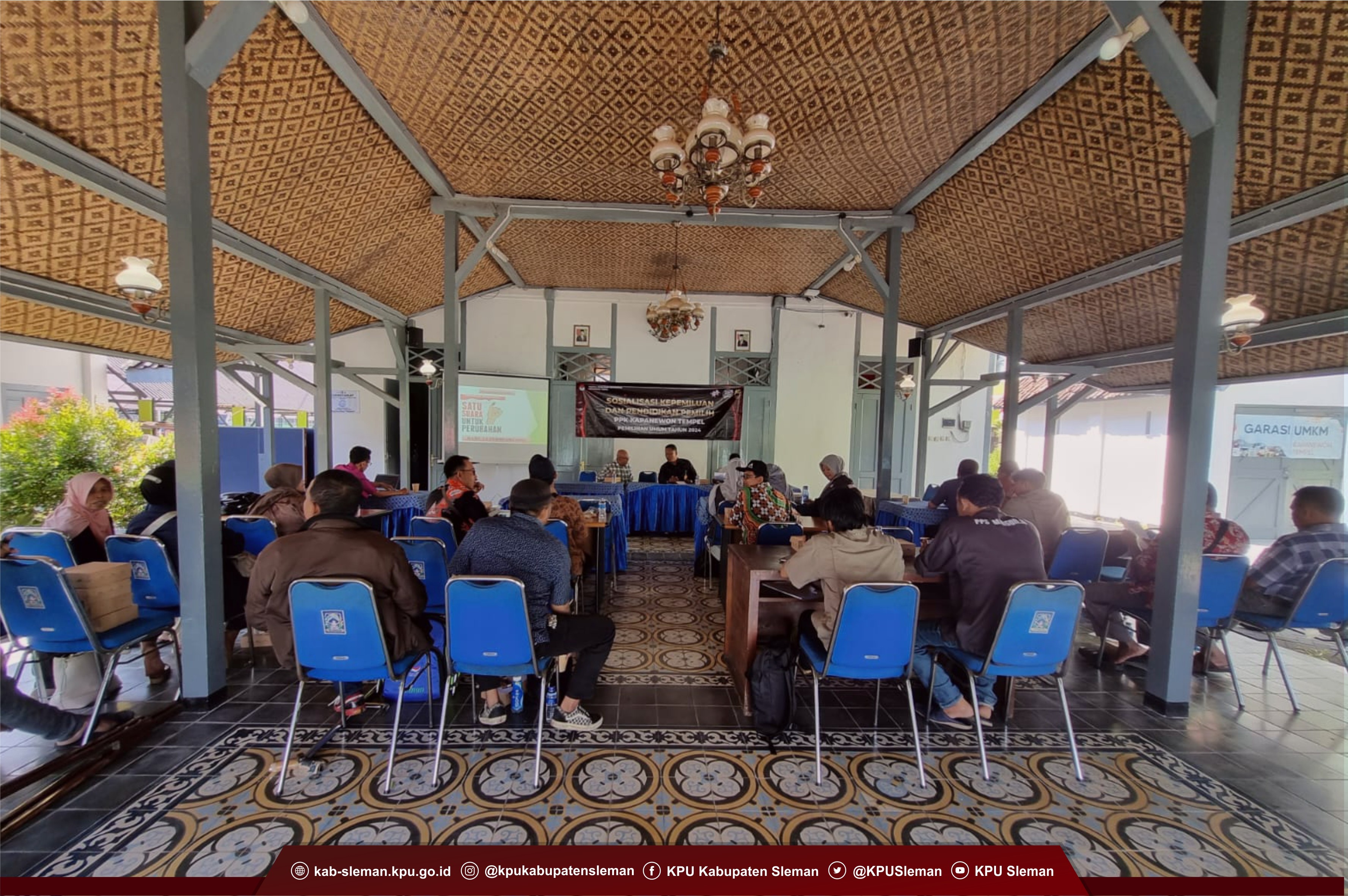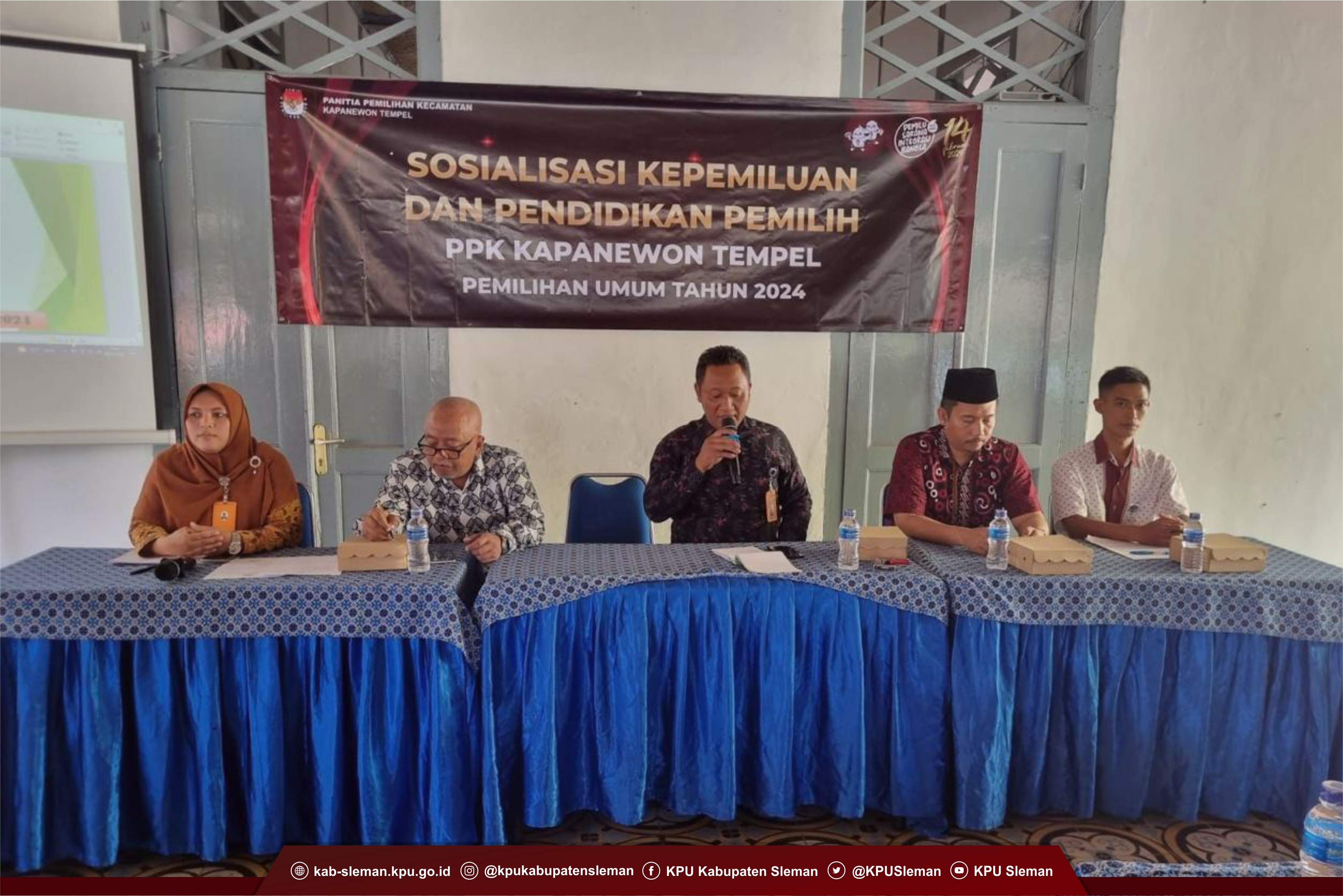 Sleman (31/05) - KPU Kabupaten Sleman kembali menjadi narasumber dalam kegiatan Sosialisasi Kepemiluan dan Pendidikan Pemilih yang diselenggarakan oleh PPK Kapanewon Tempel pada Jumat (26/05). Sosialisasi ini dilaksanakan bersama Ketua Paguyuban Dukuh Cokro Pamungkas dan perwakilan PPS Divisi Sosialisasi se-Kapanewon Tempel. Peserta yang hadir dalam kegiatan ini yakni pengurus Persatuan Penyandang Disabilitas Indonesia (PPDI) yang bertempat di kantor Kapanewon Tempel.