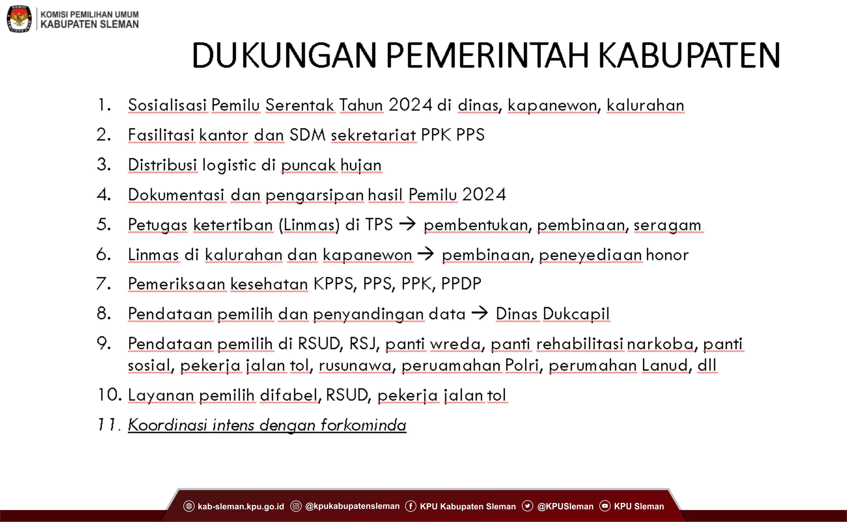 Dukungan Pemkab Sleman secara terperinci memang tidak disampaikan dalam rapat tersebut, akan tetapi sudah disampaikan langsung kepada masing-masing pimpinan OPD terkait. Dukungan tersebut di antaranya adalah sosialisasi Pemilu Serentak 2024, fasilitasi kantor dan SDM sekretariat PPK dan PPS, membantu kelancaran distribusi logistik, dokumentasi dan pengarsipan hasil pemilu, petugas ketertiban (Linmas) di TPS, Linmas di kalurahan dan kapanewon, pemeriksaan kesehatan badan ad hoc, pendataan pemilih dan penyandingan data pemilih, pendataan pemilih di tempat tertentu, dan layanan pemilih khusus.