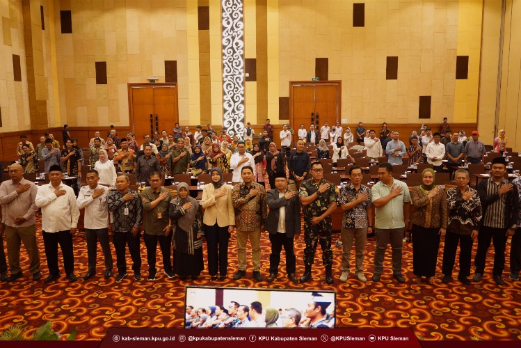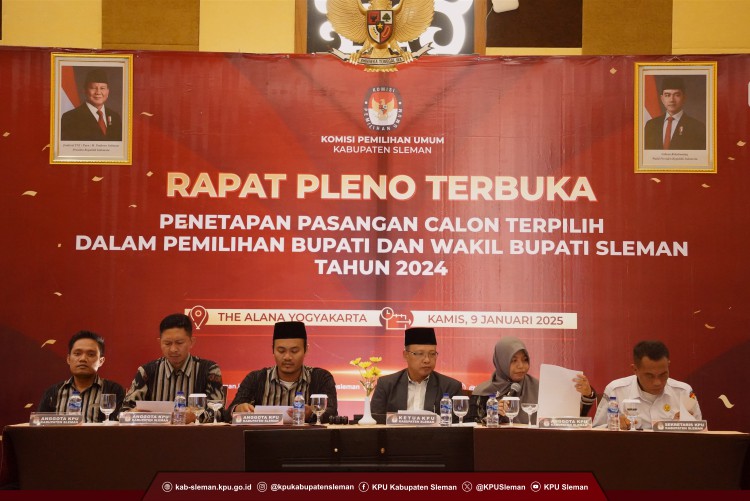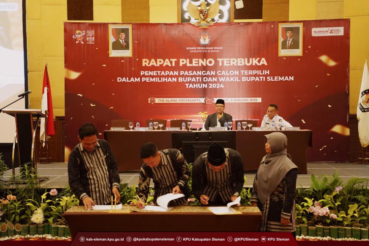 Sleman - KPU Kabupaten Sleman melaksanakan Rapat Pleno Terbuka Penetapan Pasangan Calon Terpilih dalam Pemilihan Bupati dan Wakil Bupati Sleman Tahun 2024 pada Kamis (09/01). Kegiatan yang dilaksanakan di The Alana Hotel Yogyakarta dihadiri oleh Pasangan Calon Terpilih, H. Harda Kiswaya, S.E., M.Si. - Danang Maharsa, S.E., Partai Politik Peserta Pemilu 2024, KPU DIY, Forkompimda Sleman, Bawaslu Kabupaten Sleman, Ormas/LSM tingkat Kabupaten Sleman, serta PPK dan Sekretaris se-Kabupaten Sleman.