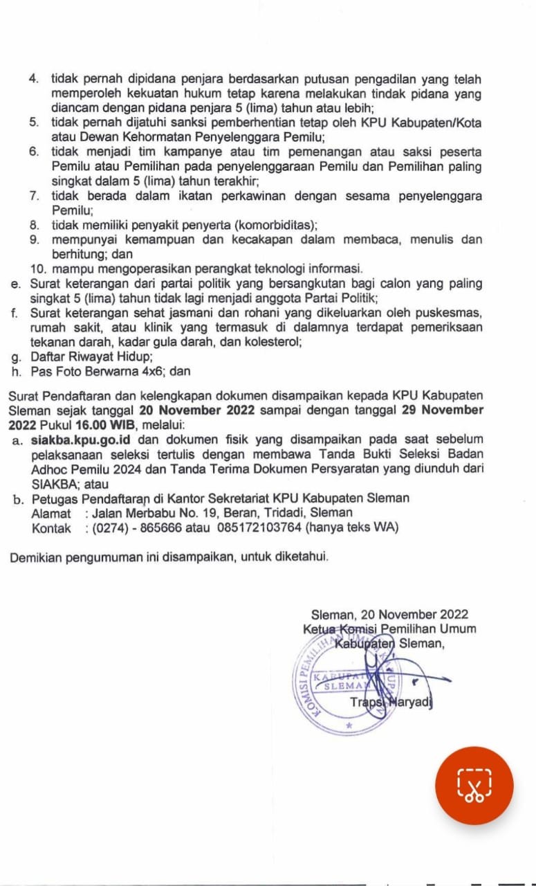Pengumuman KPU Kabupaten Sleman Nomor : 402/PP.04.1-Pu/3404/2022 tanggal 20 November 2022 tentang Seleksi Calon Anggota Panitia Pemilihan Kecamatan untuk Pemilihan Umum Tahun 2024.