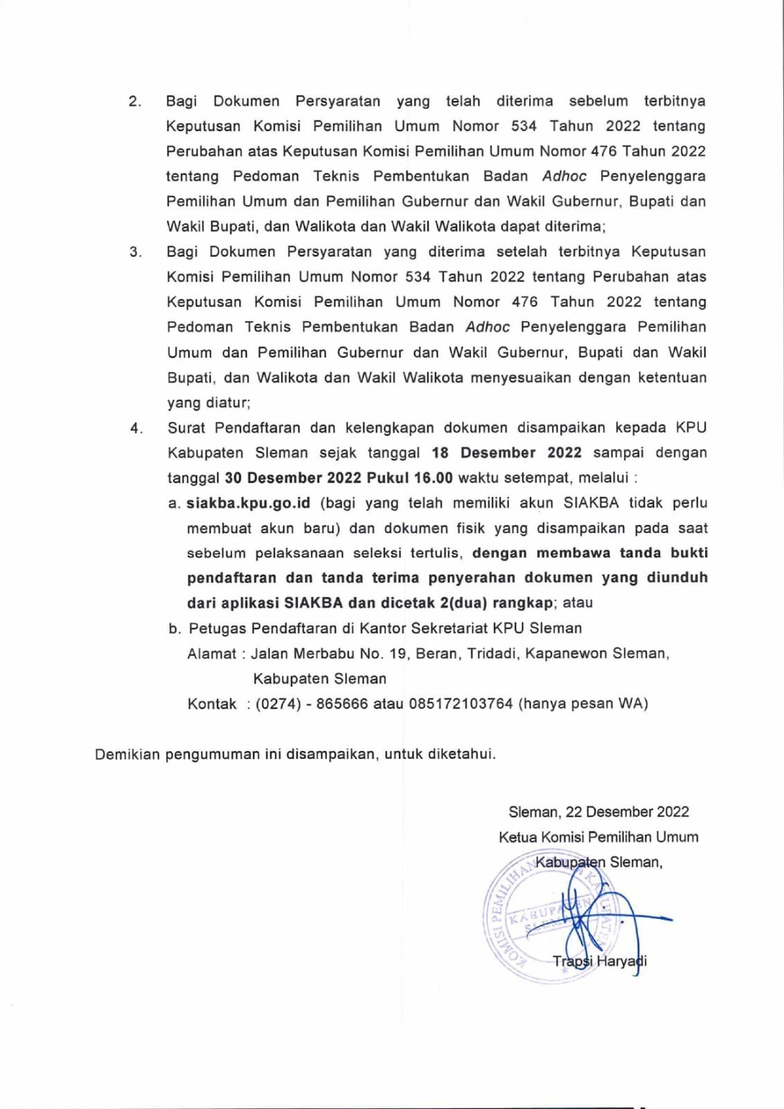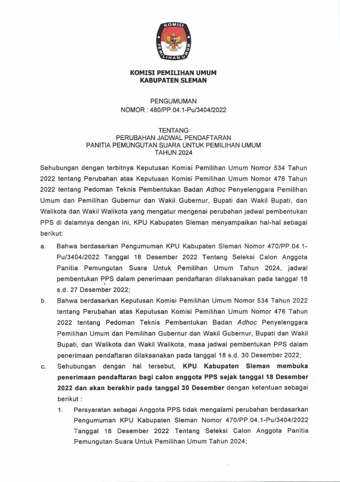 Pengumuman KPU Kabupaten Sleman Nomor : 480/PP.04.1-Pu/3404/2022 tentang Perubahan Jadwal Pendaftaran Panitia Pemungutan Suara Untuk Pemilihan Umum Tahun 2024