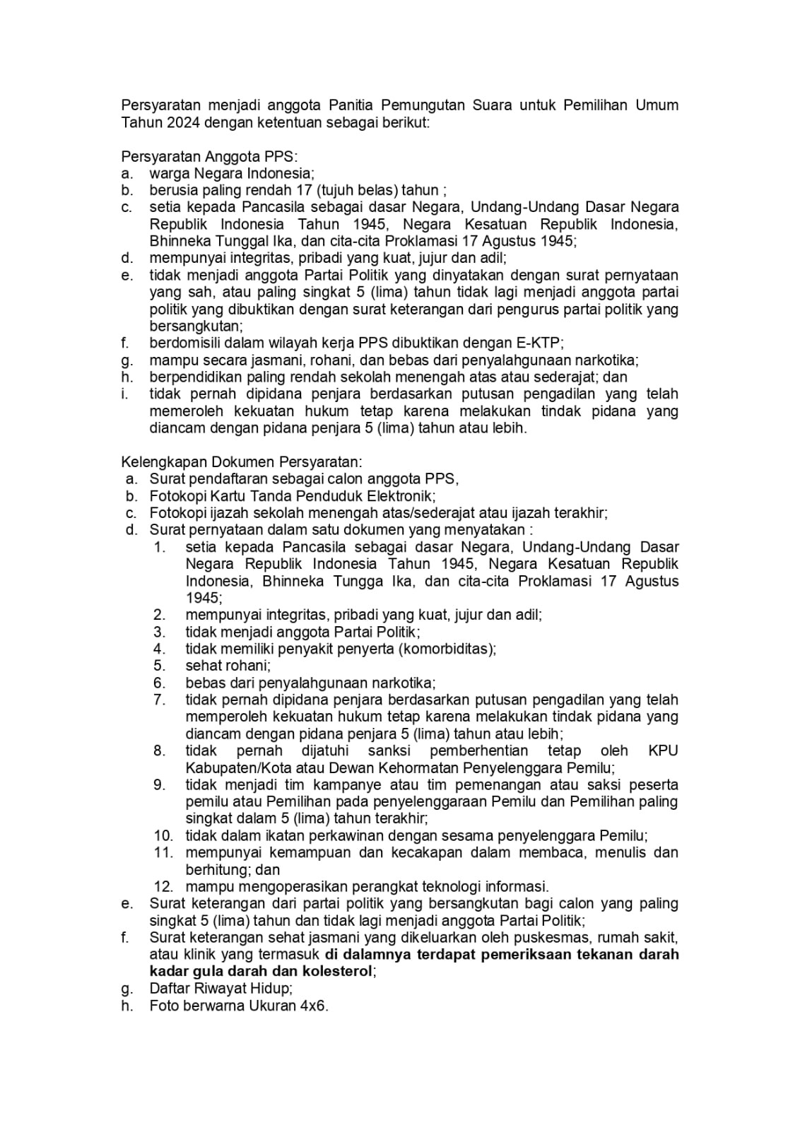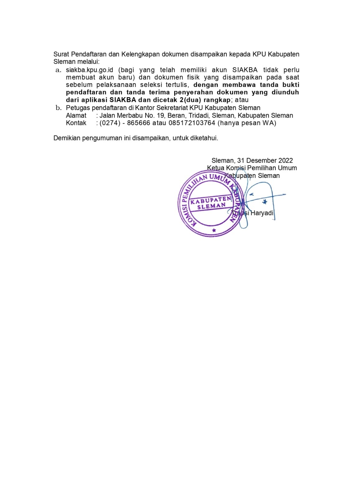 Pengumuman KPU Kabupaten Sleman Nomor : 495/PP.04.1-Pu/3404/2022 tentang Perpanjangan Pendaftaran Seleksi Calon Anggota Panitia Pemungutan Suara Untuk Pemilihan Umum Serentak Tahun 2024.