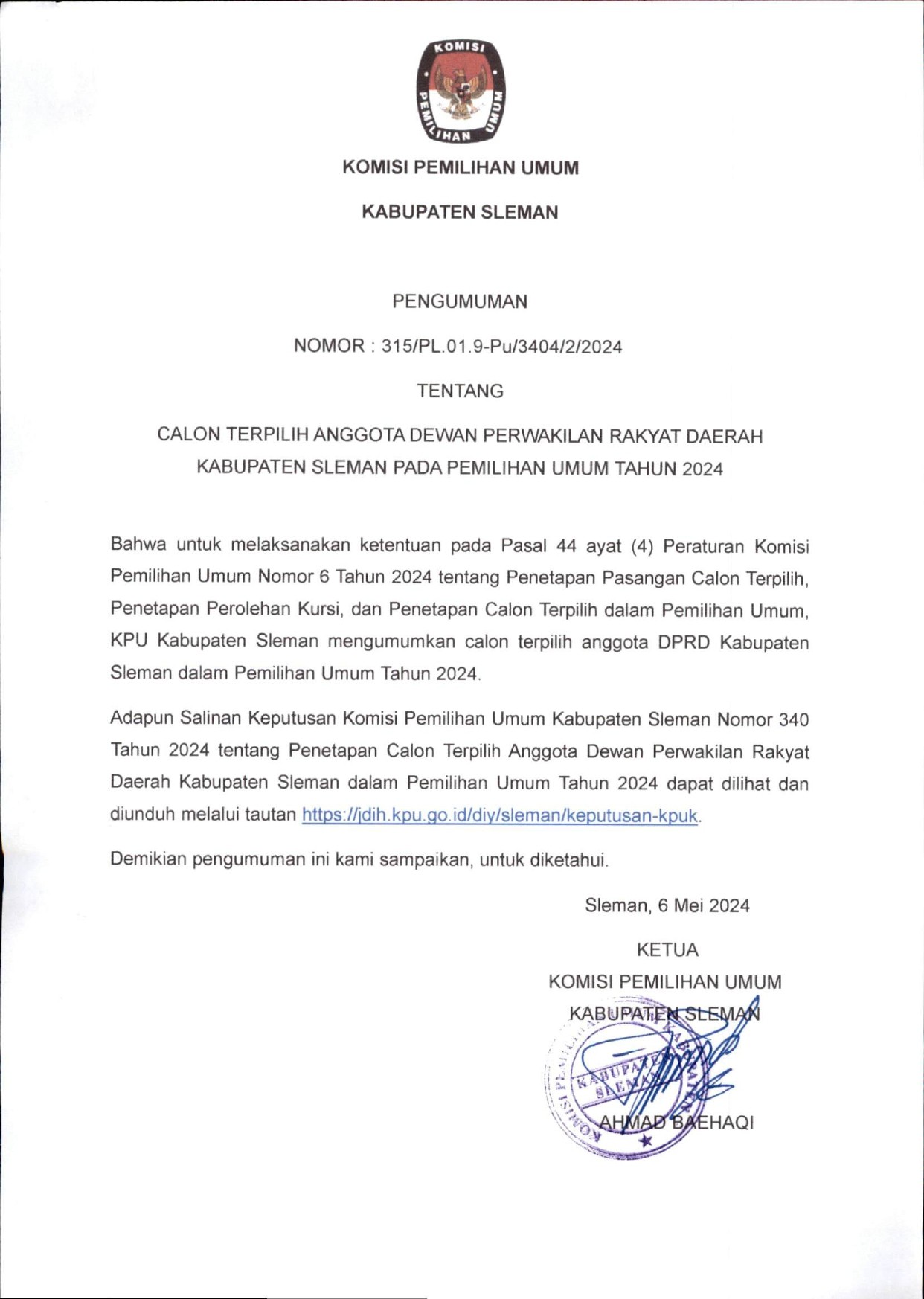 Pengumuman KPU Kabupaten Sleman Nomor 315/PL.01.9-Pu/3404/2/2024 Tentang Calon Terpilih Anggota Dewan Perwakilan Rakyat Daerah Kabupaten Sleman Pada Pemilihan Umum Tahun 2024.