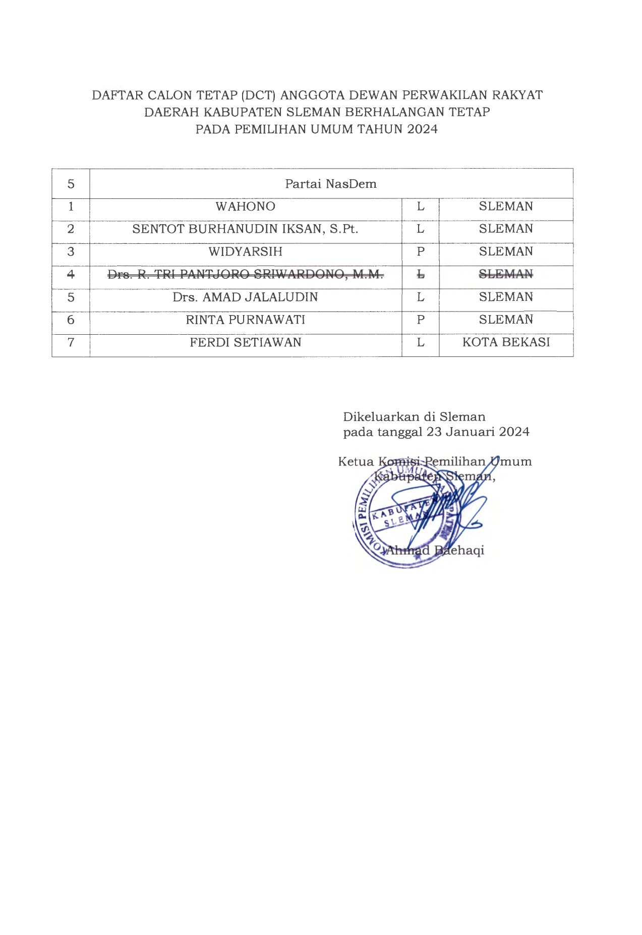 Pengumuman KPU Kabupaten Sleman Tentang Daftar Calon Tetap Anggota DPRD Kabupaten Sleman Berhalangan Tetap Dalam Pemilihan Umum Tahun 2024