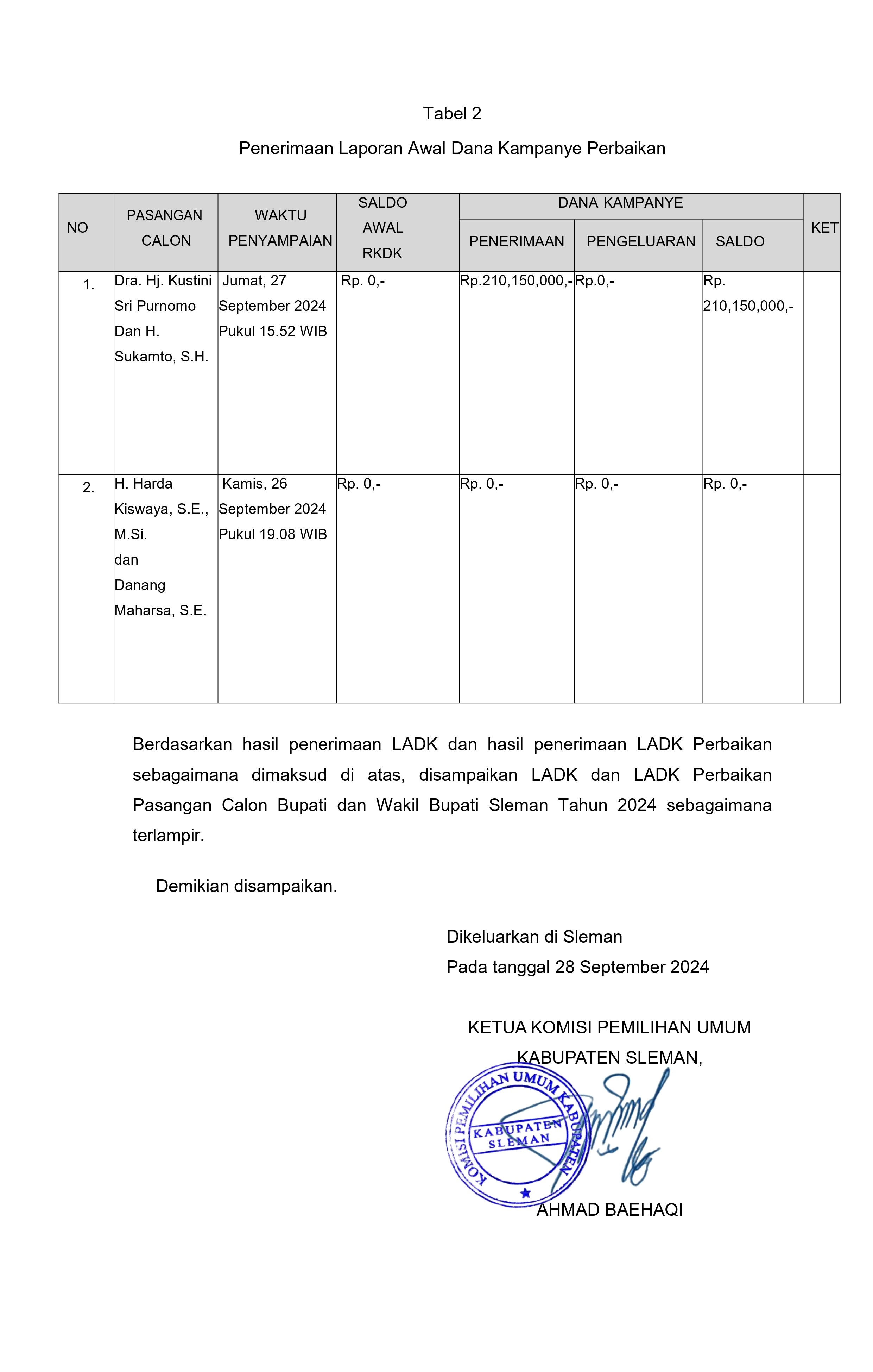 Pengumuman KPU Kabupaten Sleman Tentang Hasil Penerimaan Laporan Awal Dana Kampanye dan Laporan Awal Dana Kampanye Perbaikan Pemilihan Bupati dan Wakil Bupatii Sleman Tahun 2024