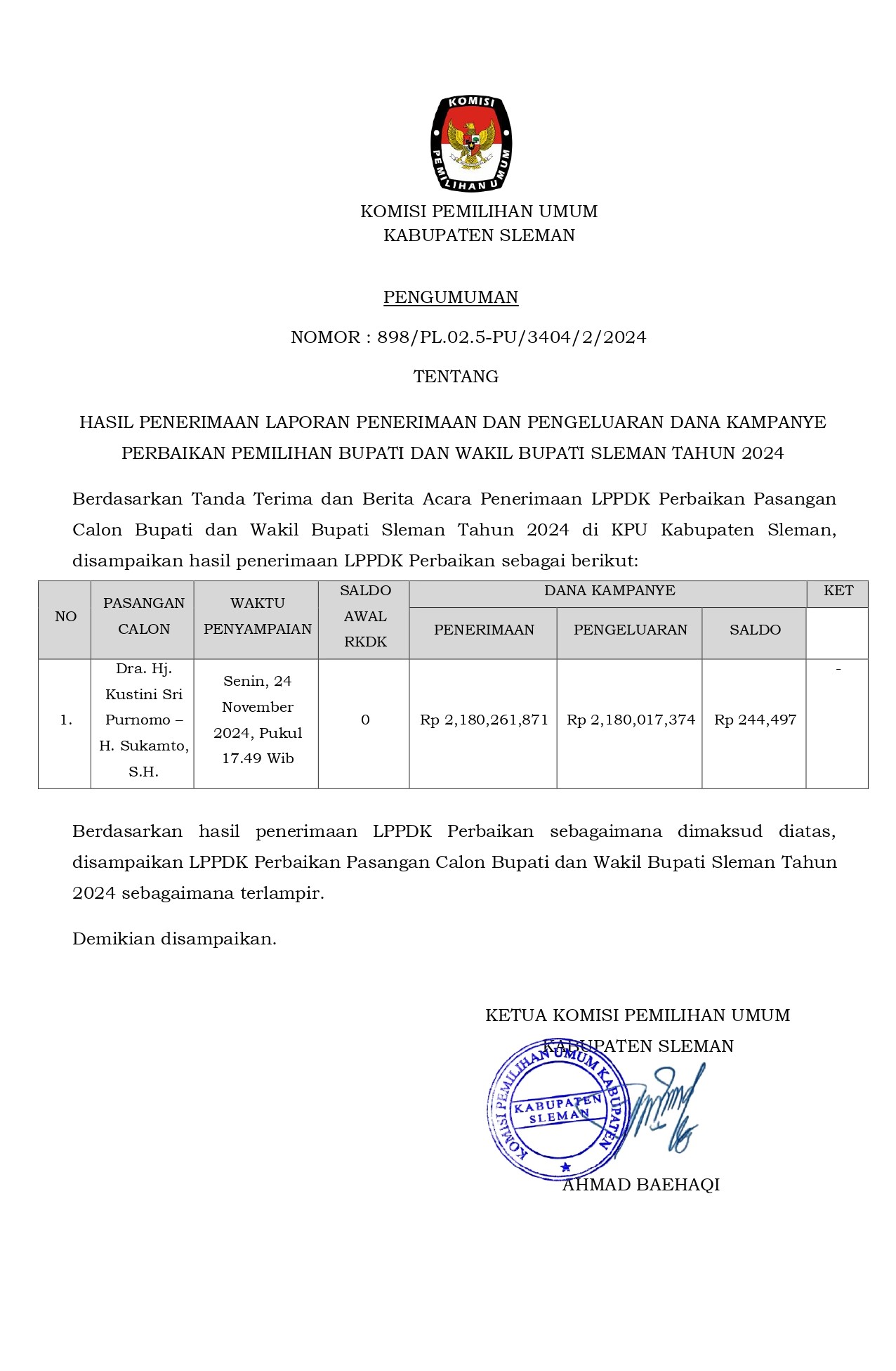 Pengumuman KPU Kabupaten Sleman Nomor 898/PL.02.5-Pu/3404/2/2024 tentang Hasil Penerimaan Laporan Peneriman dan Pengeluaran Dana Kampanye Perbaikan Pemilihan Bupati dan Wakil Bupati Sleman Tahun 2024.