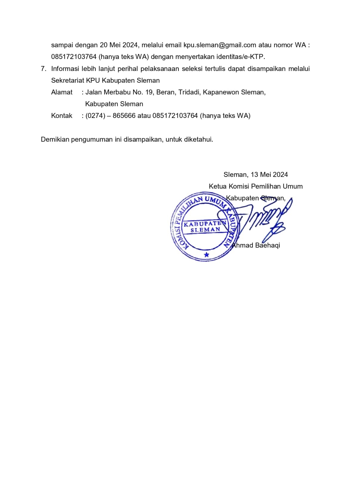 Pengumuman KPU Kabupaten Sleman tentang Hasil Seleksi Administrasi Calon Anggota PPS untuk Pilbup Sleman 2024