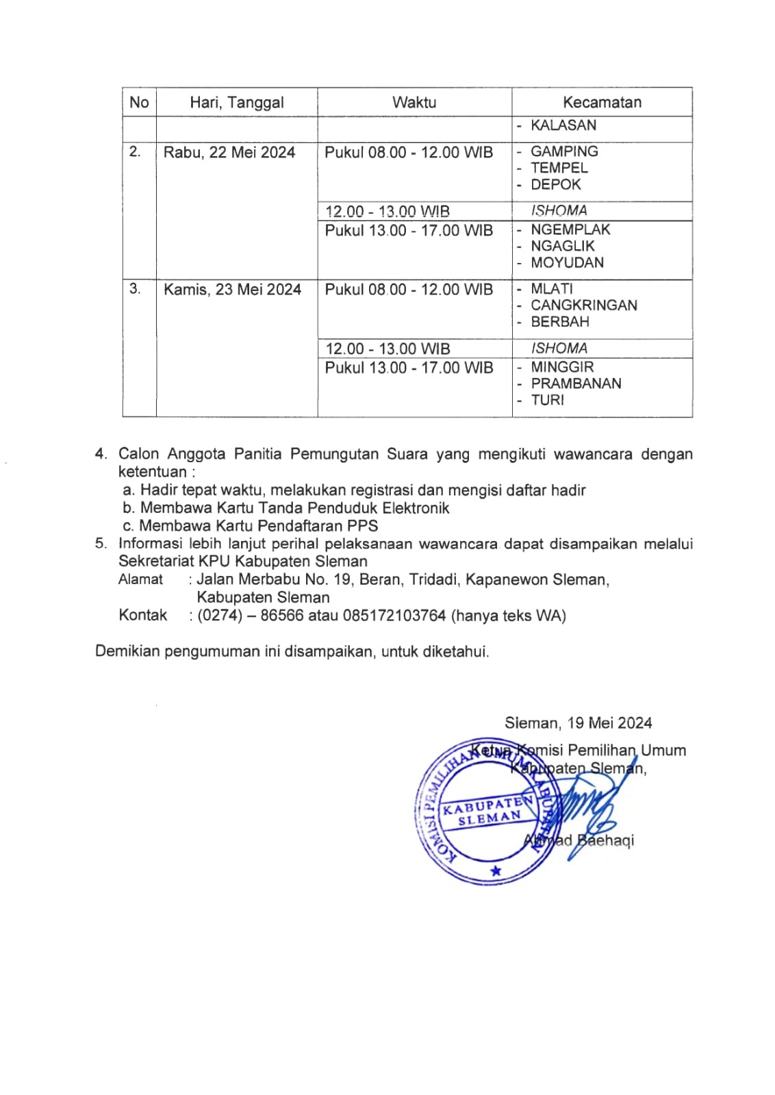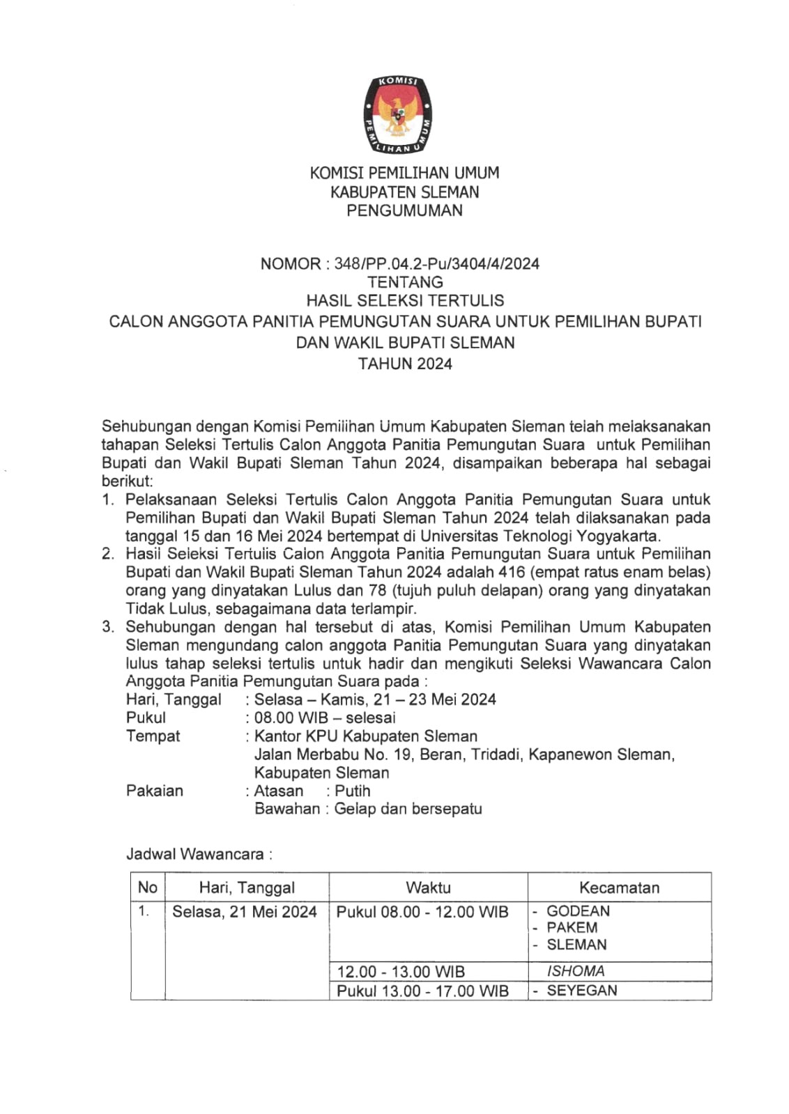 Pengumuman KPU Kabupaten Sleman Nomor 348/PP.04.2-Pu/3404/4/2024 tentang Hasil Seleksi Tertulis Calon Anggota Panitia Pemungutan Suara Untuk Pemilihan Bupati dan Wakil Bupati Sleman Tahun 2024.