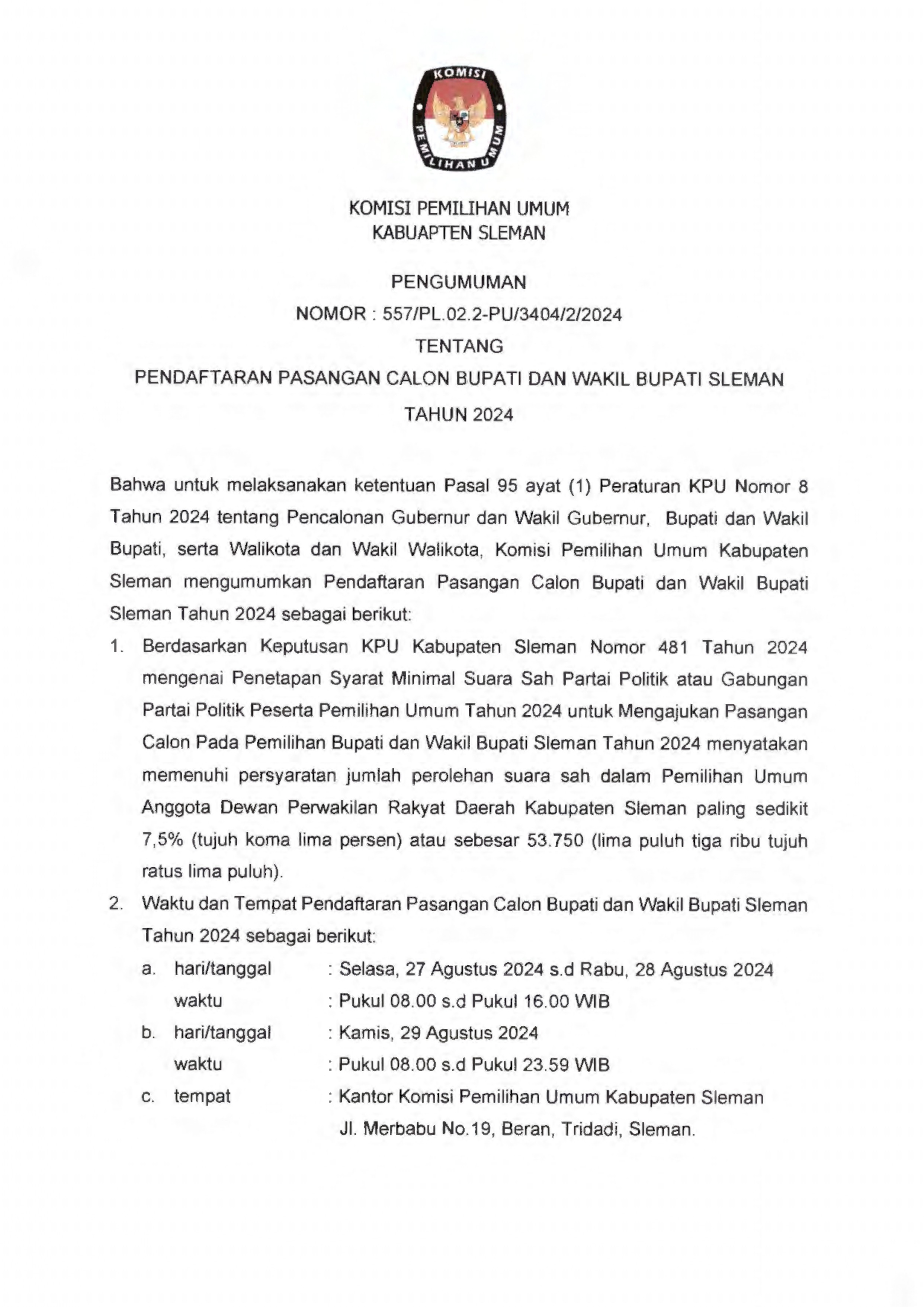 Pengumuman KPU Kabupaten Sleman Nomor :557/PL.02.2-PU/3404/2/2024 tanggal 24 Agustus 2024 tentang Pendaftaran Pasangan Calon Bupati dan Wakil Bupati Sleman Tahun 2024.