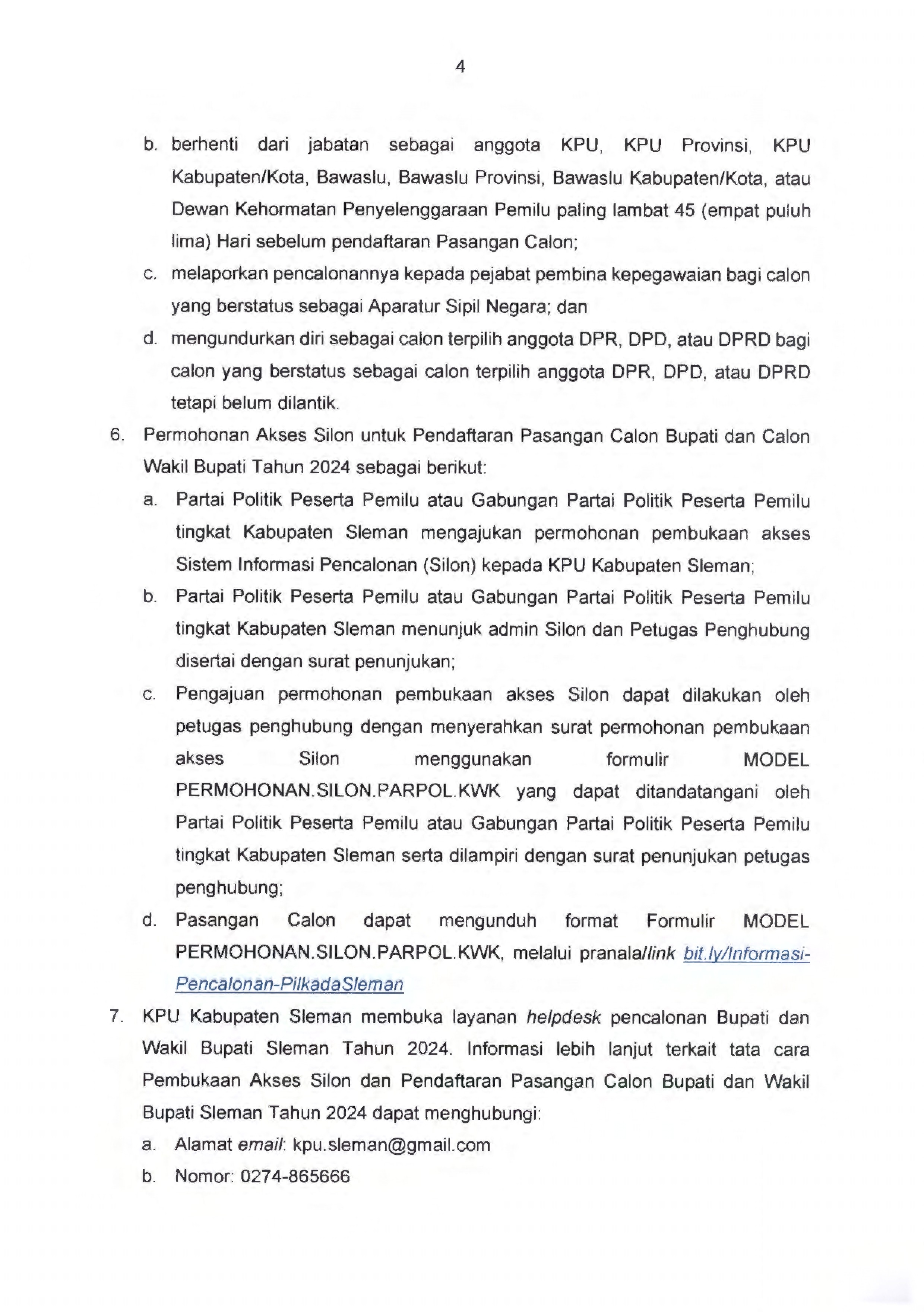 Selengkapnya pengumuman pendaftaran Bupati dan Wakil bupati Tahun 2024 dapat diunduh dengan cara klik DISINI dan dokumen persyaratan dapat diunduh dengan cara klik INFORMASI PENCALONAN PILKADA SLEMAN