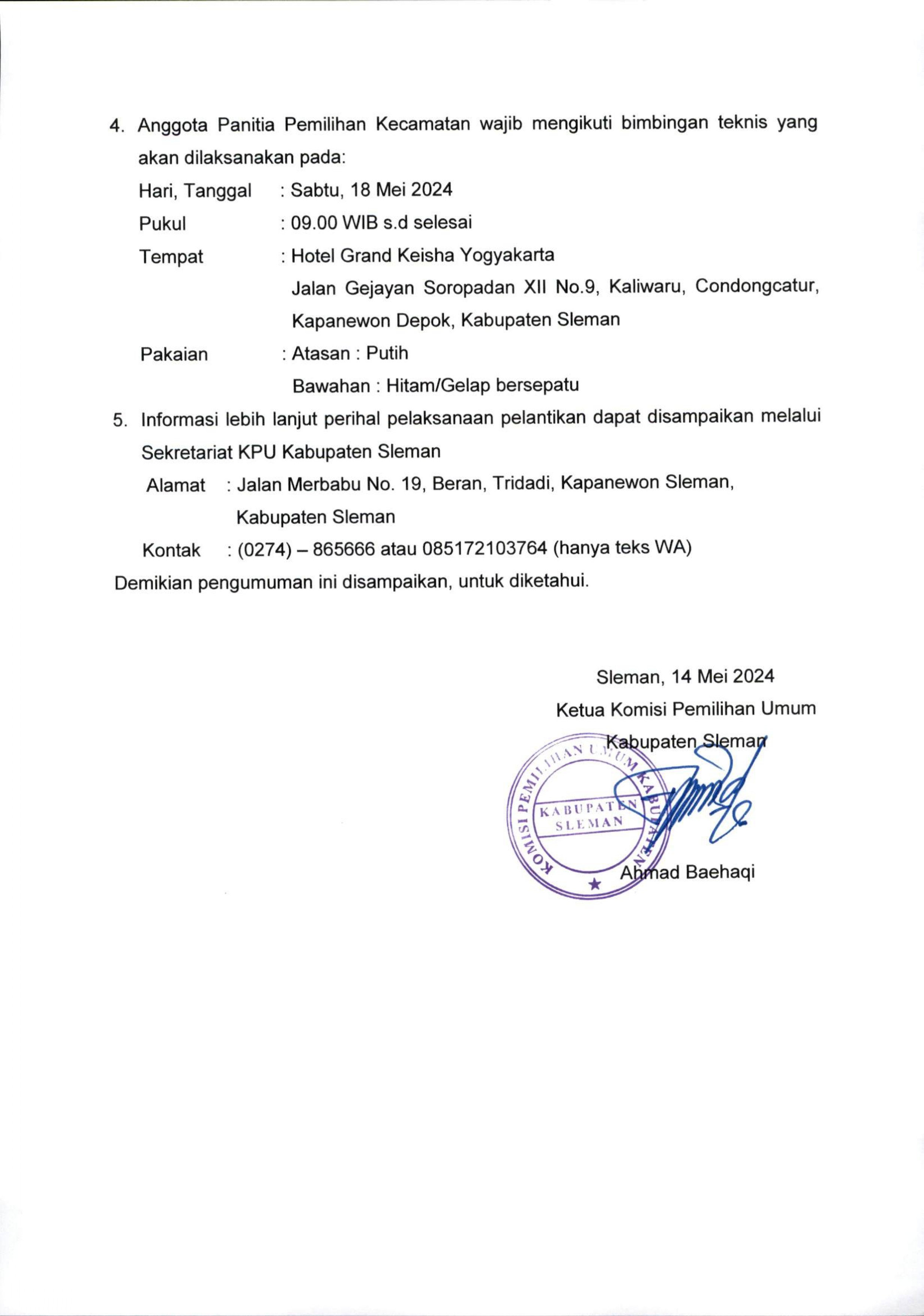Pengumuman KPU Kabupaten Sleman Tentang Penetapan Hasil Seleksi Calon Anggota Panitia Pemilihan Kecamatan Terpilih Untuk Pilbup Tahun 2024