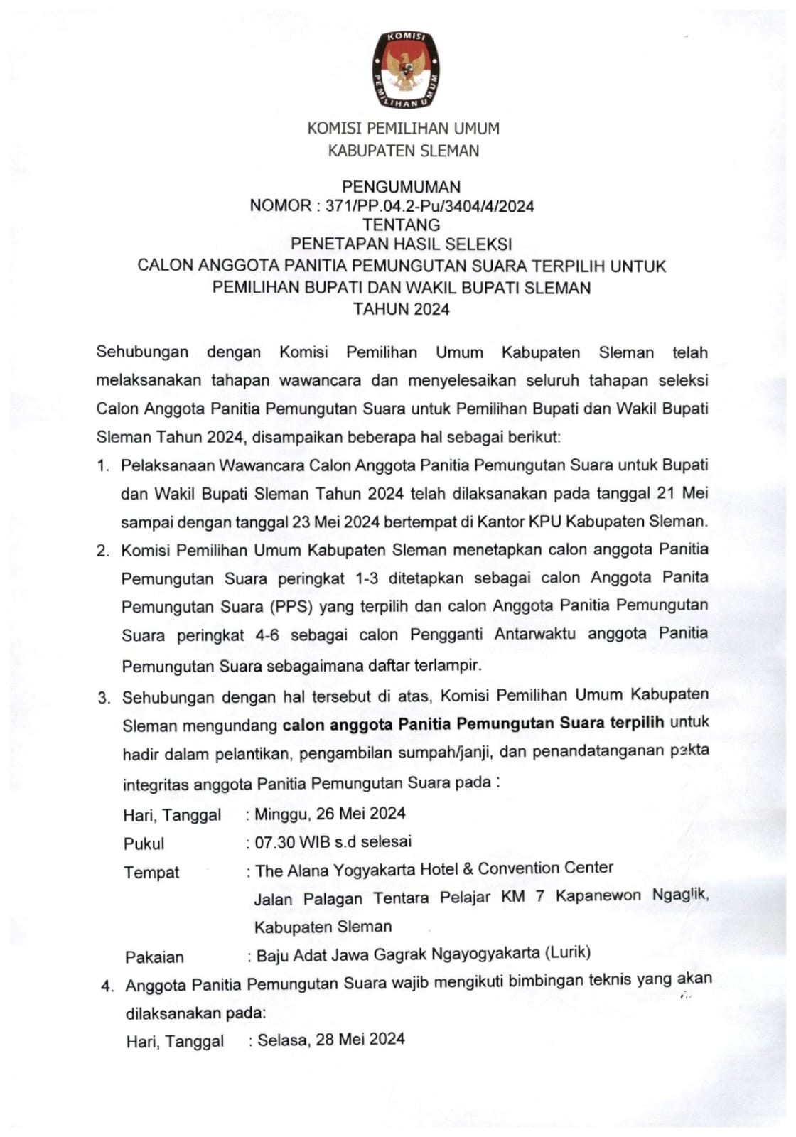 Pengumuman KPU Kabupaten Sleman Nomor 371/PP.04.2-Pu/3404/4/2024 tentang Penetapan Hasil Seleksi Calon Anggota Panitia Pemungutan Suara Terpilih untuk Pilbup Sleman Tahun 2024.