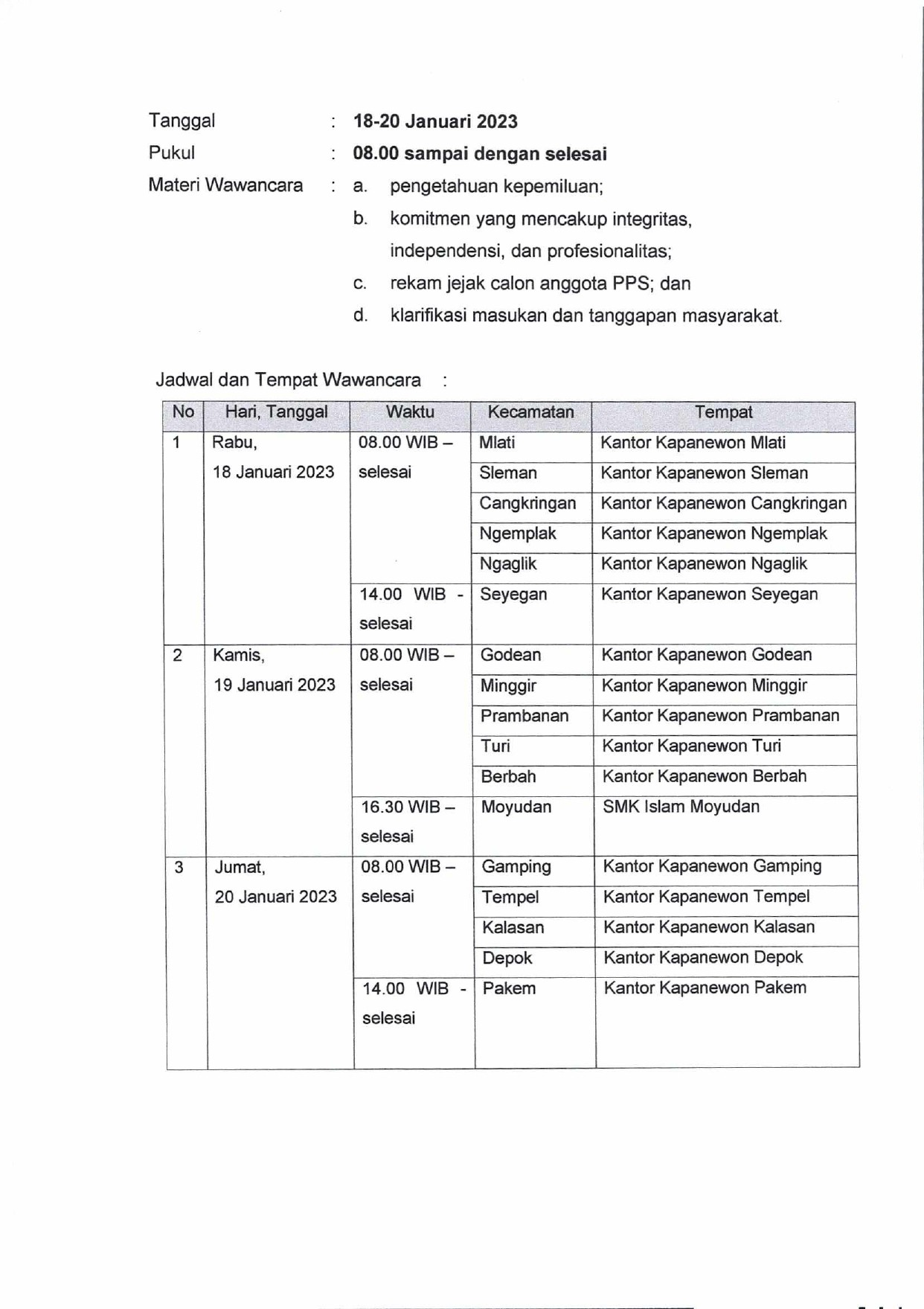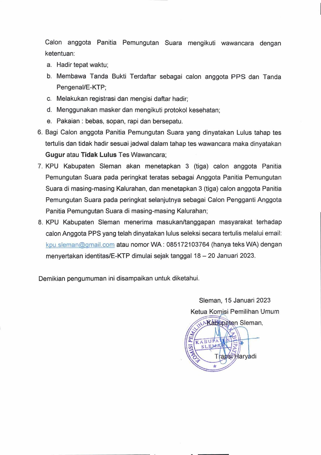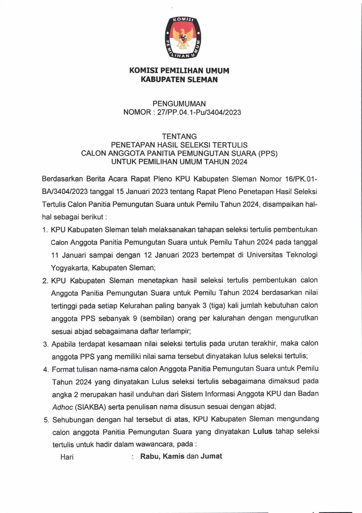 Pengumuman KPU Kabupaten Sleman Nomor : 27/PP.04.1-Pu/3404/20223 tentang Penetapan Hasil Seleksi Tertulis Calon Anggota Panitia Pemungutan Suara (PPS) Untuk Pemilihan Umum Tahun 2024.