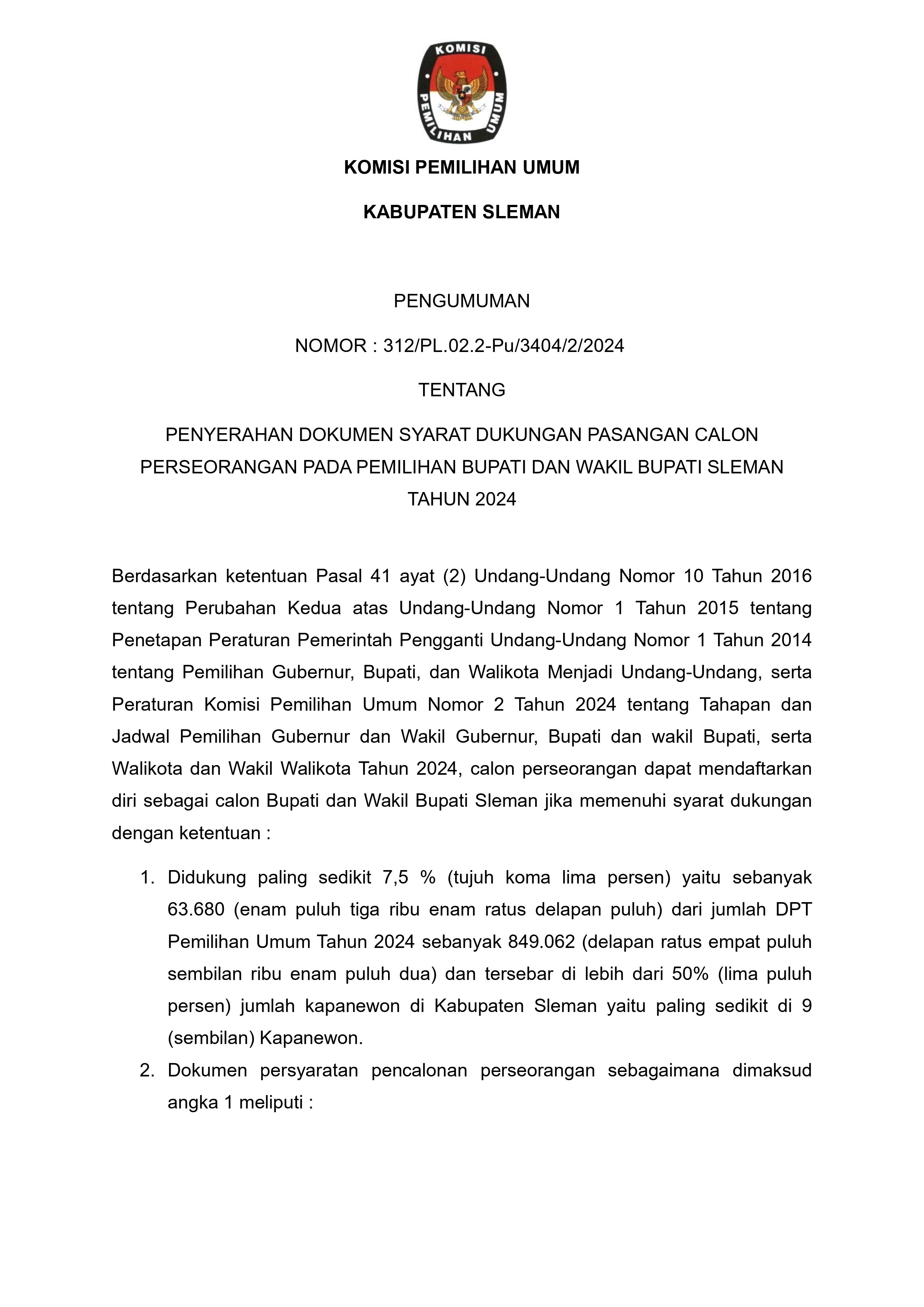 Pengumuman KPU Kabupaten Sleman Nomor 312/PL.02.2-Pu/3404/2/2024 tentang Penyerhaan Dokumen Syarat Dukungan Pasangan Calon Perseorangan Pada Pemilihan Bupati dan Wakil Bupati Sleman Tahun 2024.