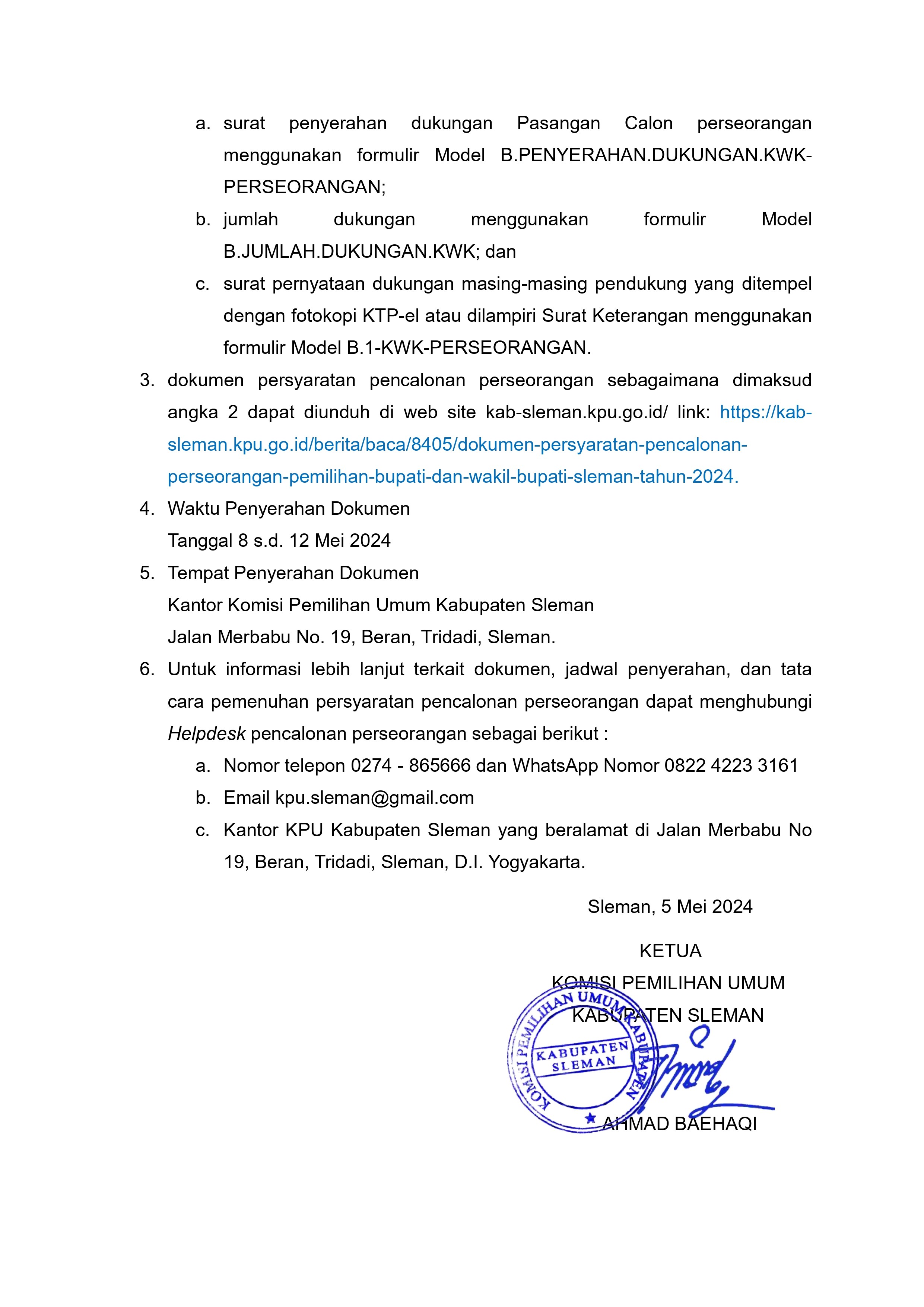 Pengumuman KPU Kabupaten Sleman tentang Penyerahan Dokumen Syarat Dukungan Pasangan Calon Perseorangan Pada Pemilihan Bupati dan Wakil Bupati Sleman Tahun 2024