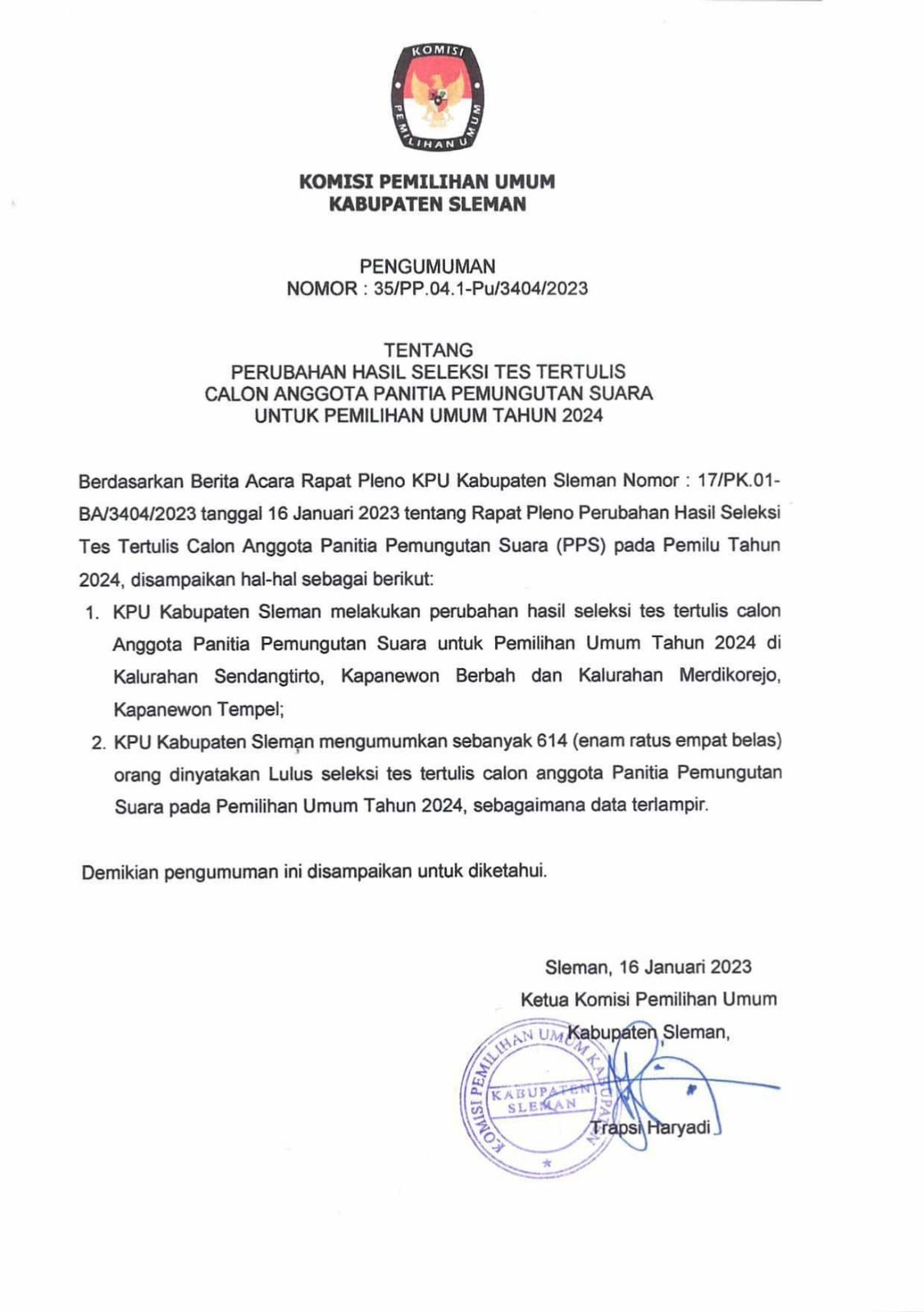 Pengumuman KPU Kabupaten Sleman Tentang Perubahan Hasil Seleksi Tertulis Calon Anggota Panitia Pemungutan Suara Untuk Pemilihan Umum Tahun 2024