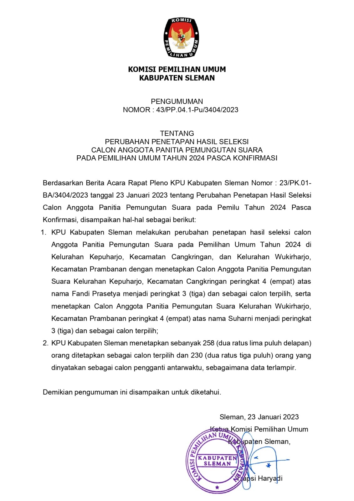 Pengumuman KPU Kabupaten Sleman Nomor : 43/PP.04.1-Pu/3404/2023 tentang Perubahan Penetapan Hasil Seleksi Calon Anggota Panitia Pemungutan Suara Pada Pemilihan Umum Tahun 2024 Pasca Konfirmasi.