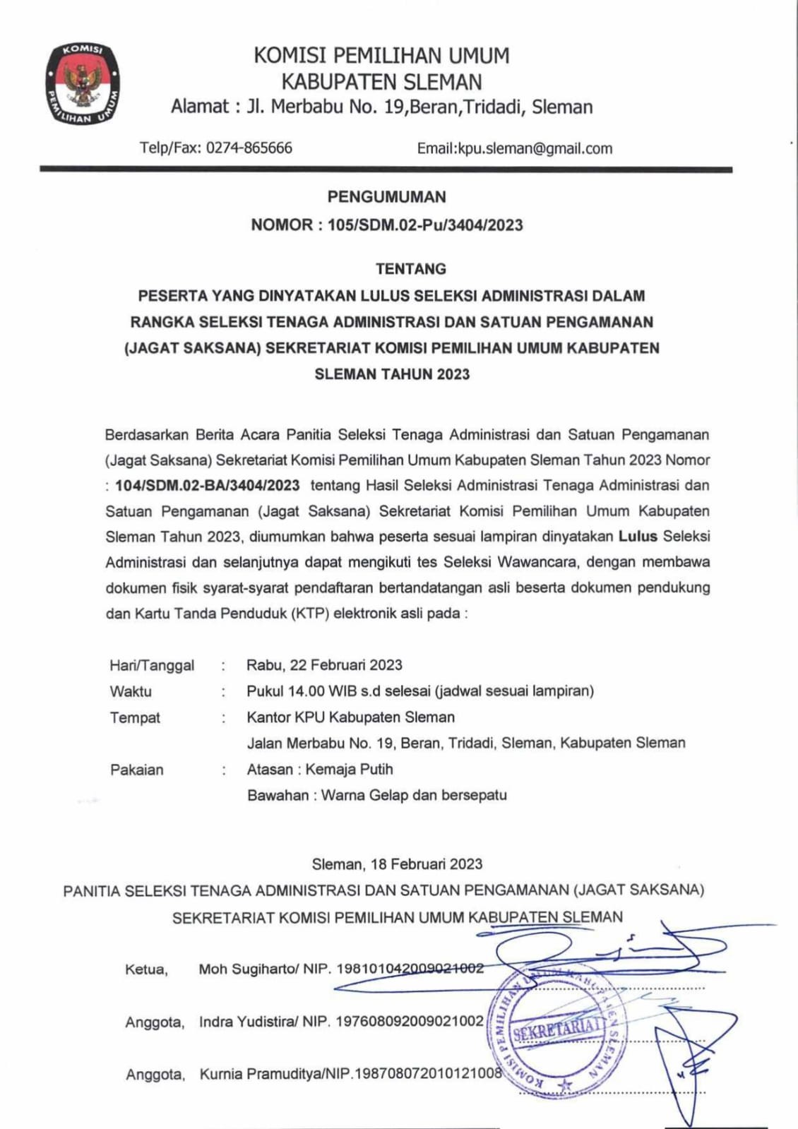 Pengumuman KPU Kabupaten Sleman Nomor 105/SDM.02-Pu/3404/2023 tanggal 18 Februari 2023 tentang Peserta Yang Dinyatakan Lulus Seleksi Administrasi dalam rangka seleksi Tenaga Administrasi dan Satuan Pengamanan (Jagat Saksana) Sekretariat KPU Kabupaten Sleman Tahun 2023.