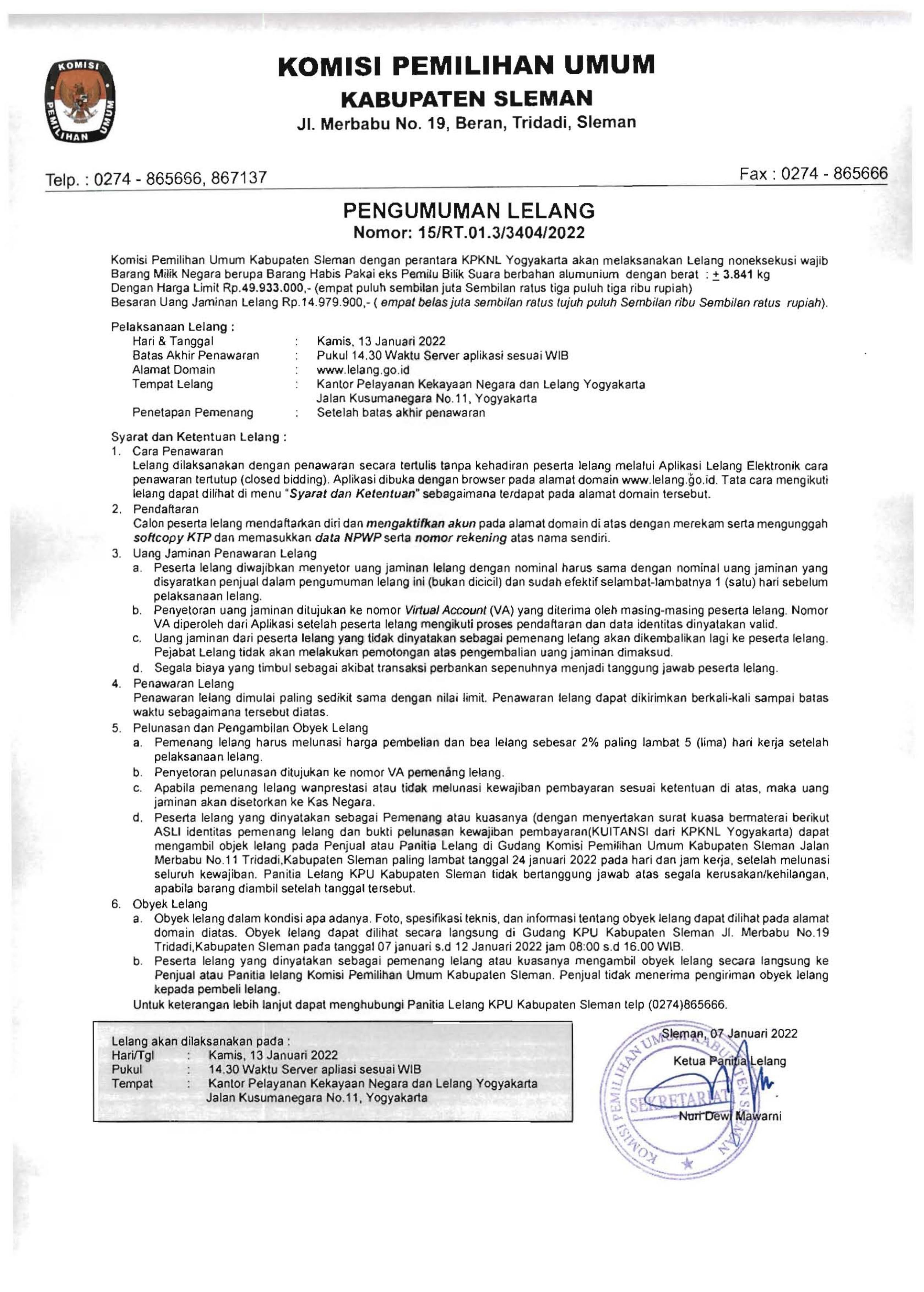 Pengumuman Lelang KPU Kabupaten Sleman Nomor 15/RT.01.3/3404/2022 Tentang Lelang Barang Habis Pakai eks Pemilu berupa Bilik Suara Berbahan Alumunium