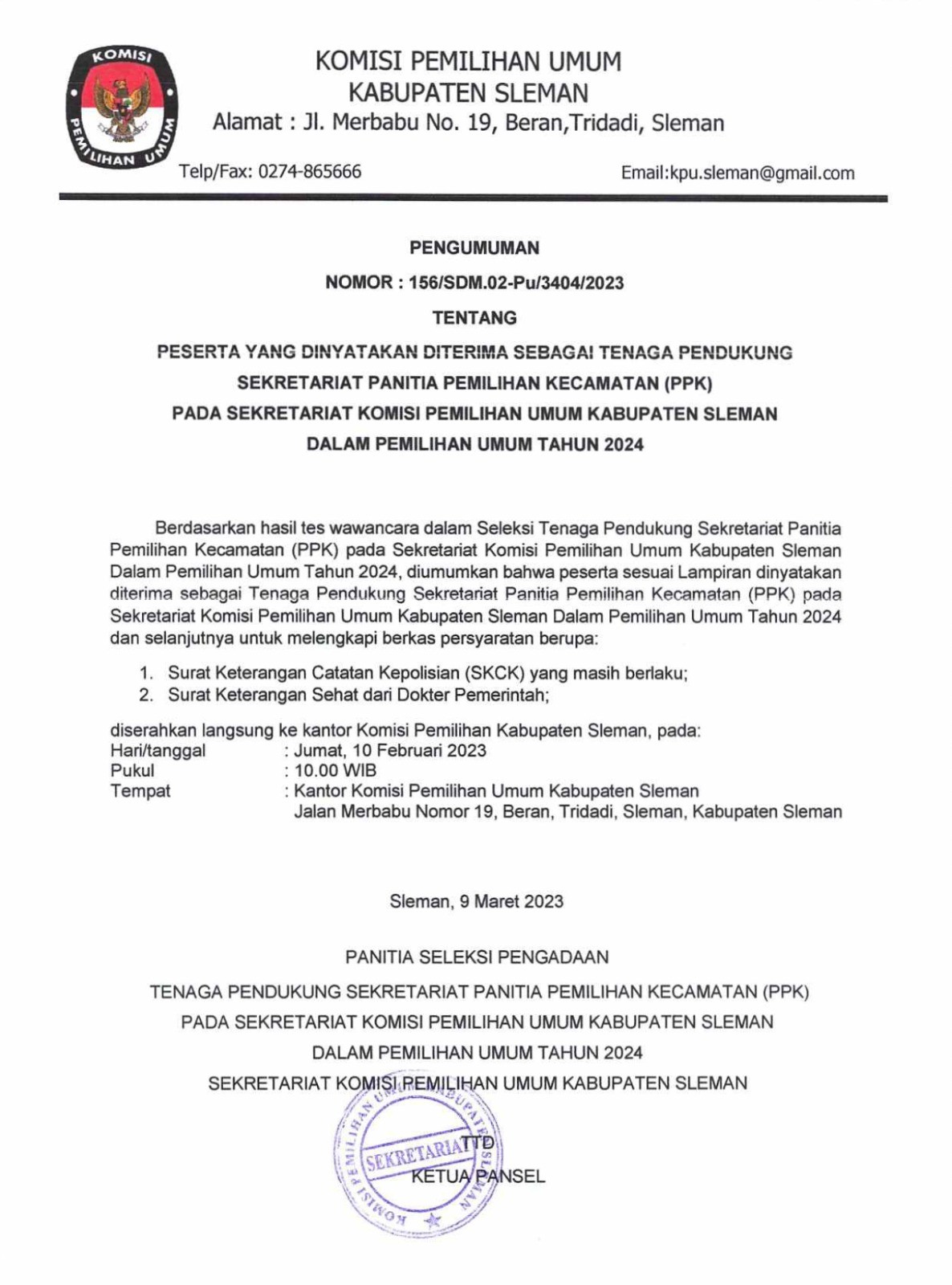 Pengumuman Sekretariat KPU Kabupaten Sleman Nomor : 156/SDM.02-Pu/3404/2023 tentang Peserta Yang Dinyatakan Diterima Sebagai Tenaga Pendukung Sekretariat PPK pada Sekretariat KPU Kabupaten Sleman Pada Pemilihan Umum Tahun 2024.