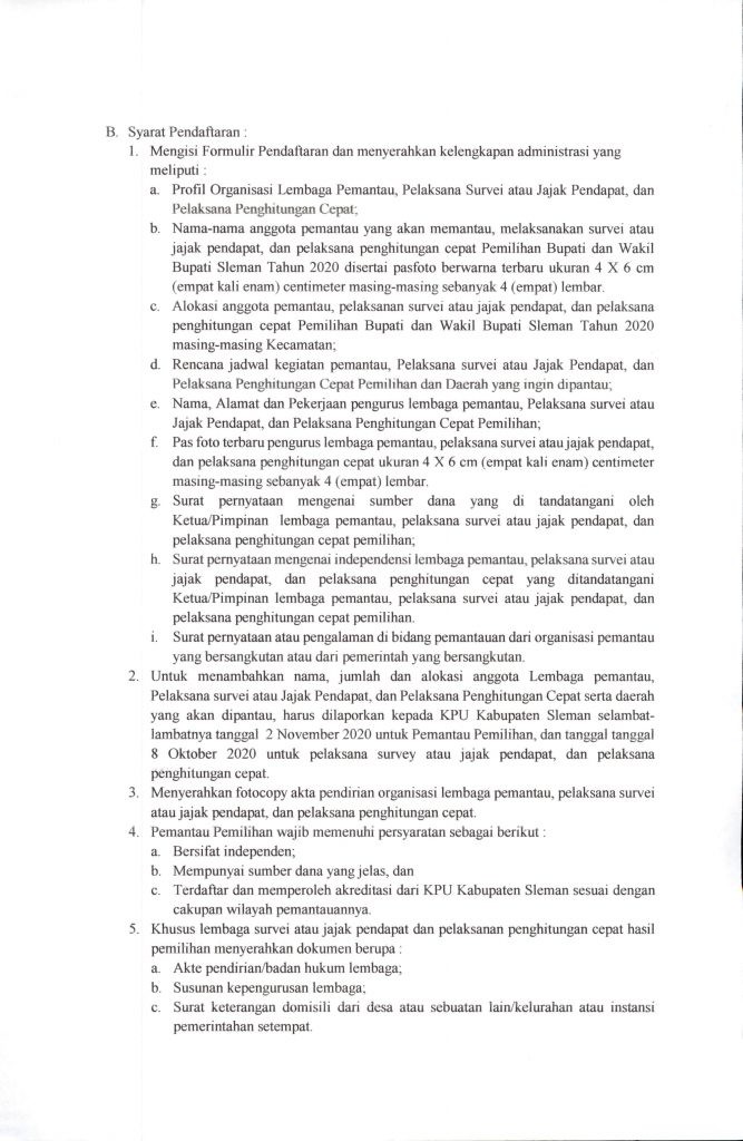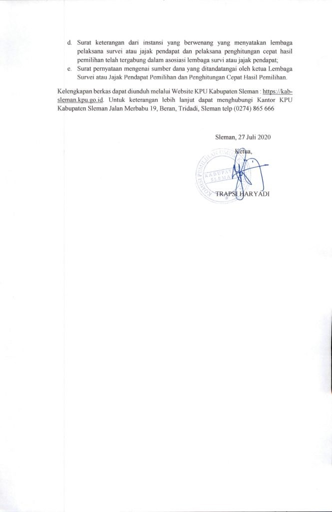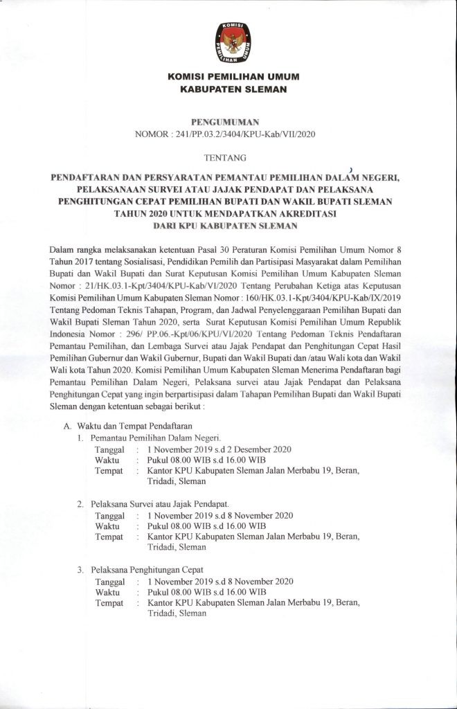 Sleman (07/08) – Pengumuman Nomor 241/PP.03.2/3404/KPU-Kab/VII/2020 tanggal 27 Juli 2020 tentang Pendaftaran dan Persyaratan Pemantau Pemilihan dalam negeri, Pelaksanaan Survei atau Jajak Pendapat dan Pelaksana Penghitungan Cepat Pemilihan Bupati dan Wakil Bupati Sleman tahun 2020 untuk Mendapatkan Akreditasi dari KPU Kabupaten Sleman.