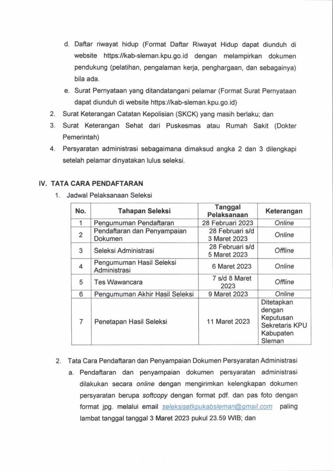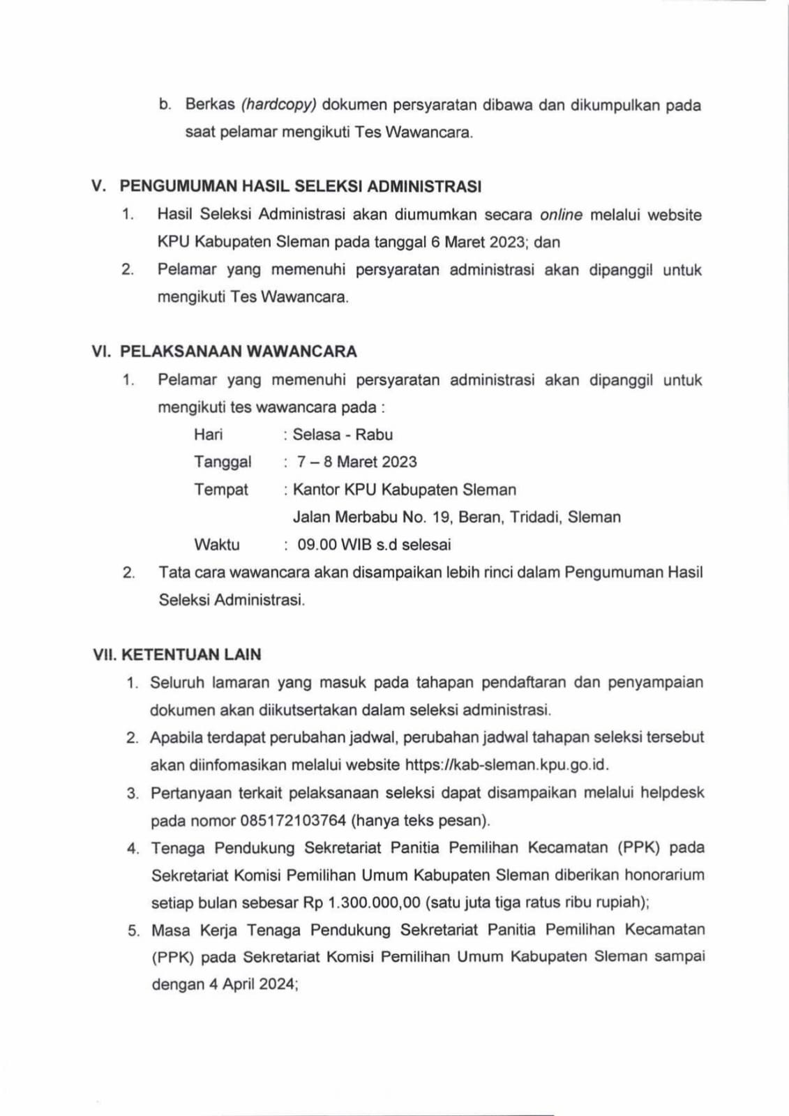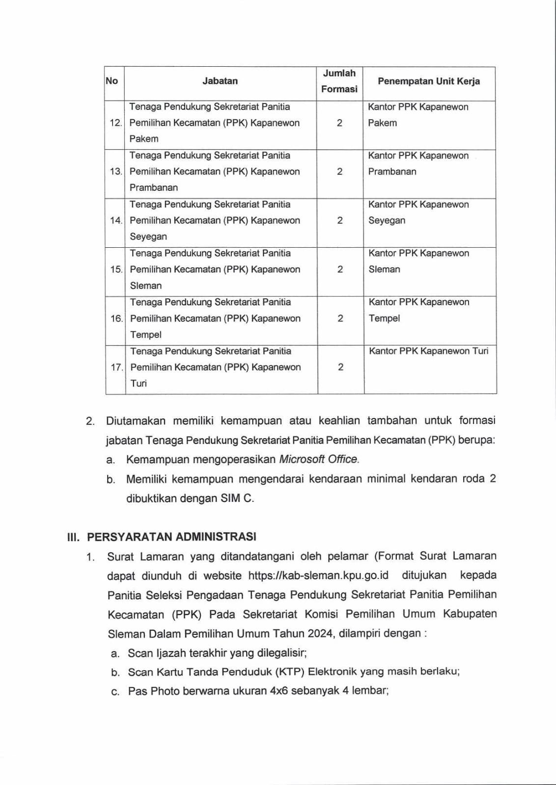 Pengumuman Sekretariat KPU Kabupaten Sleman Nomor : 127/SDM.02-Pu/3404/2023 tanggal 27 Februari 2023 tentang Lowongan Pendaftaran Tenaga Pendukung Sekretariat Panitia Pemilihan Kecamatan (PPK) pada Sekretariat Komisi Pemilihan Umum Kabupaten Sleman dalam Pemilihan Umum Tahun 2024.
