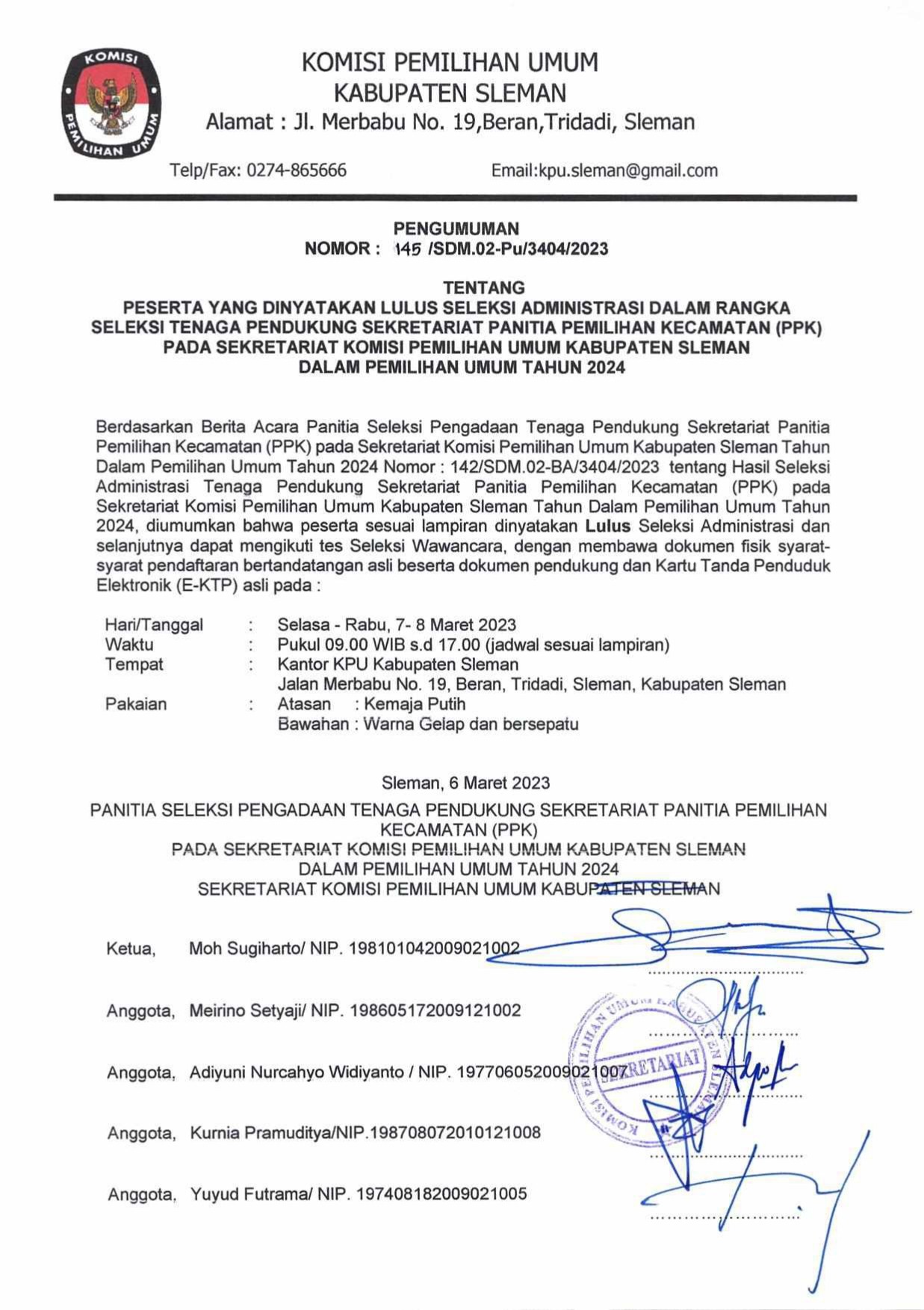 Pengumuman Sekretariat KPU Kabupaten Sleman Nomor 145/SDM.02-Pu/3404/2023 tanggal 5 Maret 2023 tentang Peserta Yang Dinyatakan Lulus Seleksi Administrasi Dalam Rangka Seleksi Tenaga Pendukung Sekretariat Panitia Pemilihan Kecamatan (PPK) Pada Sekretariat Komisi Pemilihan Umum Kabupaten Sleman dalam Pemilihan Umum Tahun 2024.