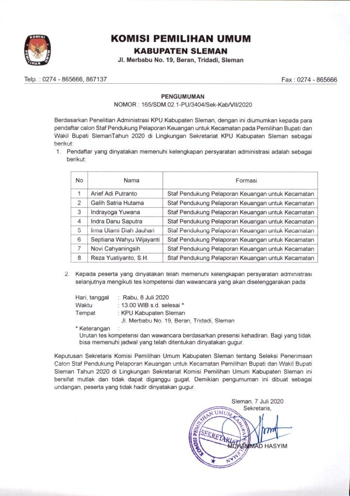 Pengumuman Seleksi Administrasi Staff Pendukung Pelaporan Keuangan KPU Kabupaten Sleman